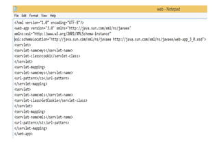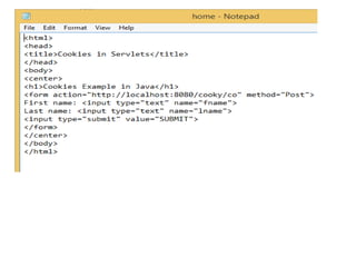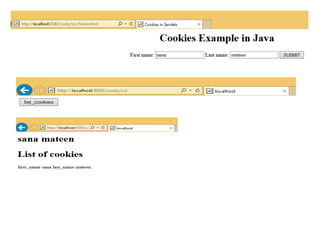 This document compares cookies and sessions for maintaining state in web applications. Cookies are small pieces of text stored on a user's browser that can be used to link pages together during a user's session. Sessions instead store changing information on the server side using a unique session ID passed from the client on each request. The document outlines how sessions work in servlets through the HttpSession interface to store and retrieve attributes across requests.