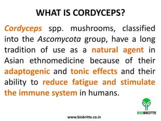 Cordyceps mushrooms have a history of use in traditional Asian medicine to increase energy and support the immune system. The active constituent cordycepin is thought to have anti-cancer properties. Cordyceps can help with energy levels, endurance, inflammation, sexual function, kidney disease, immunity, heart health, asthma, aging, and diabetes. Cordyceps militaris and Cordyceps sinensis are two common types. For athletes, cordyceps can increase VO2 max, improve fatigue resistance, and boost ATP during exercise. Most athletes take 1-3 grams per day, and cordyceps make a good pre-workout supplement due to anti-inflammatory and antioxidant effects.