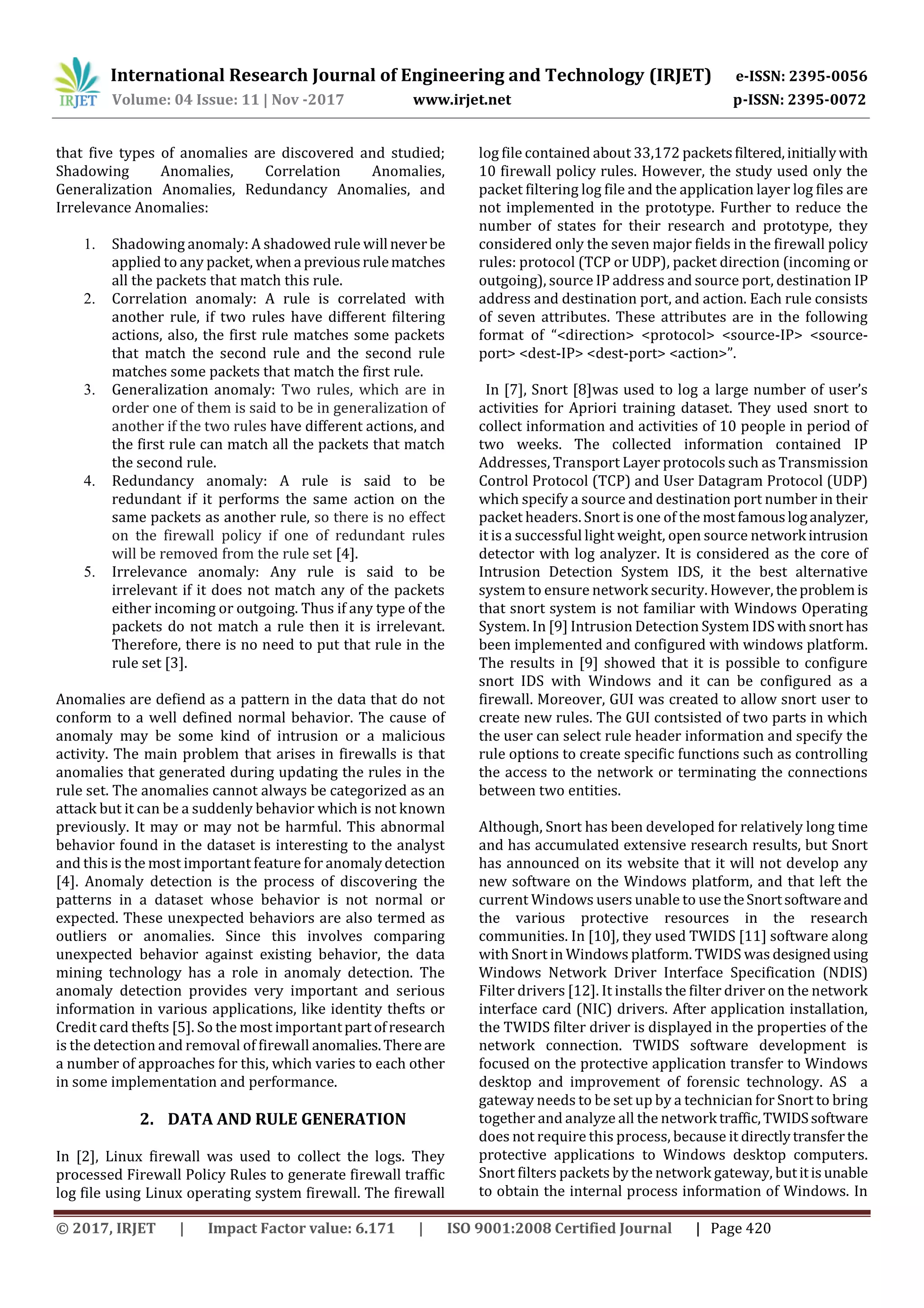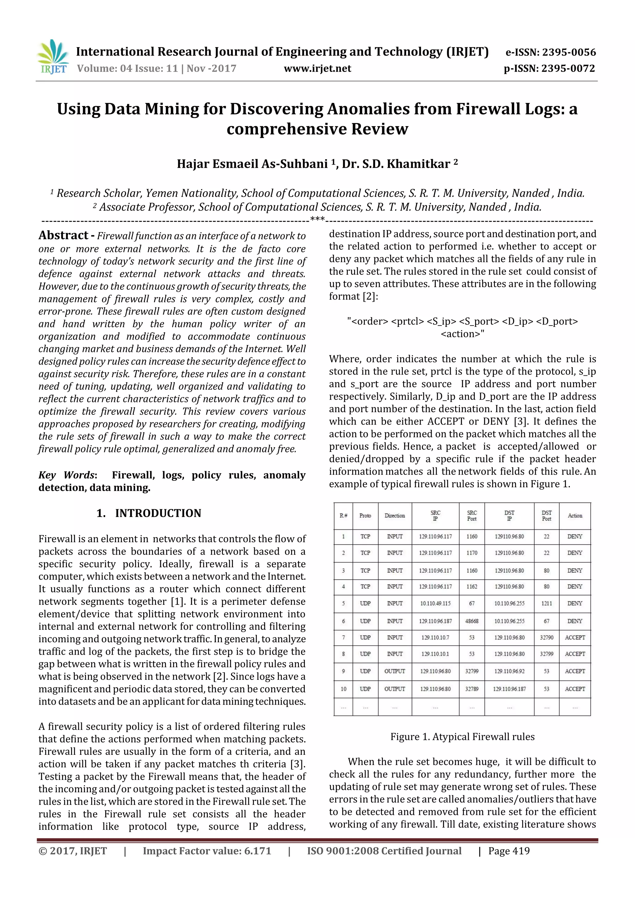 This document summarizes research on using data mining techniques to discover anomalies in firewall logs. It first provides background on firewalls and the issues around managing large and complex firewall rule sets. It then reviews different approaches that have been proposed for detecting anomalies like shadowing, correlation, generalization, redundancy, and irrelevance. Various data sources and rule generation methods are discussed. The document also summarizes several data mining techniques that have been applied to analyze firewall logs and detect anomalies, such as decision trees, association rule mining, and the Apriori algorithm. Finally, it concludes by stating that data mining provides a fast and effective way to gather useful information from large firewall logs to help optimize firewall rule sets.