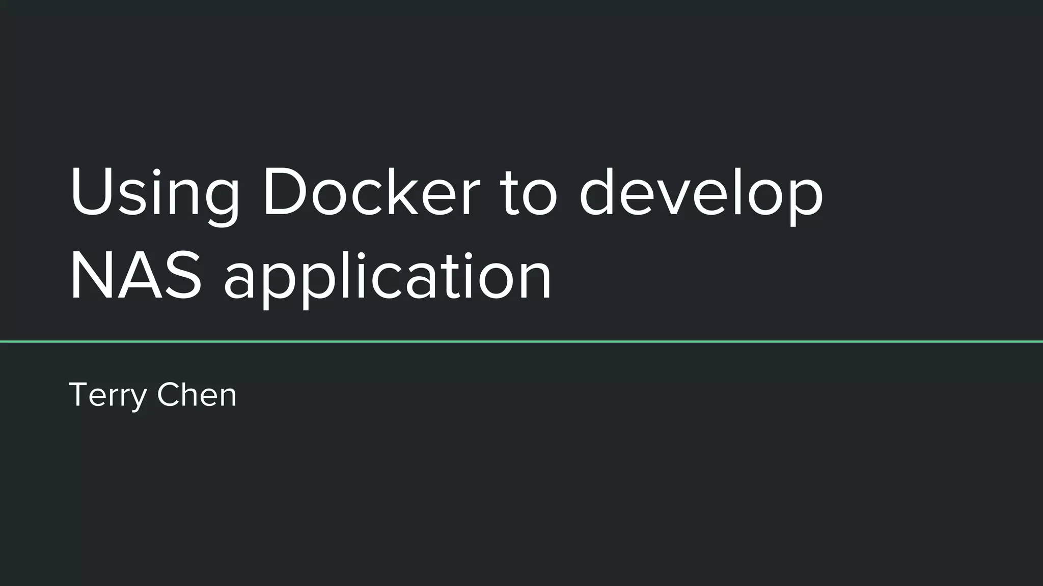 This document introduces using Docker to develop NAS applications. It begins with an overview of Docker and containers, then demonstrates how to build Docker images, run containers, and deploy NAS applications as Docker containers using Container Station. It also addresses some common questions about Docker including how to skip Container Station initialization, debug closed containers, backup container data, access NAS information from containers, and resources for learning Docker.