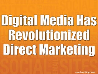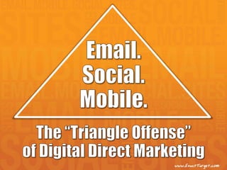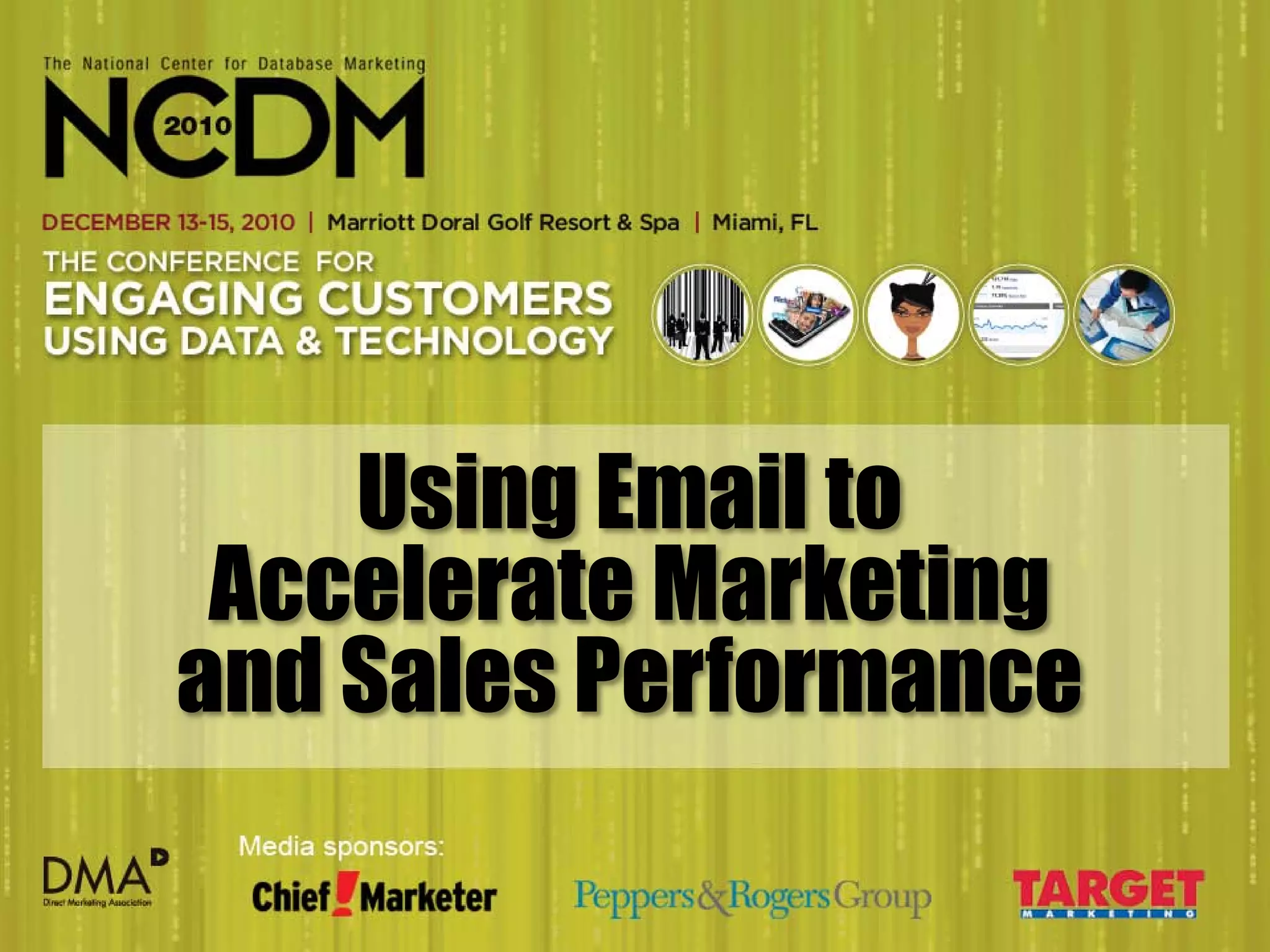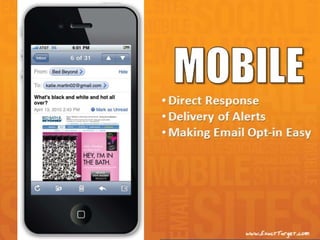 Using Email to Accelerate Marketing and Sales Performance discusses how email can be used throughout the customer lifecycle from attracting new customers to the website to retaining existing customers. It provides examples of how companies like Best Buy, Motorcycle Superstore, Expedia, and Hitachi use personalized email communications to engage customers, aid in the buying process, and drive repeat business. The document also discusses how social media and email can be combined to amplify messaging and attract new customers, as shown in Papa John's example.