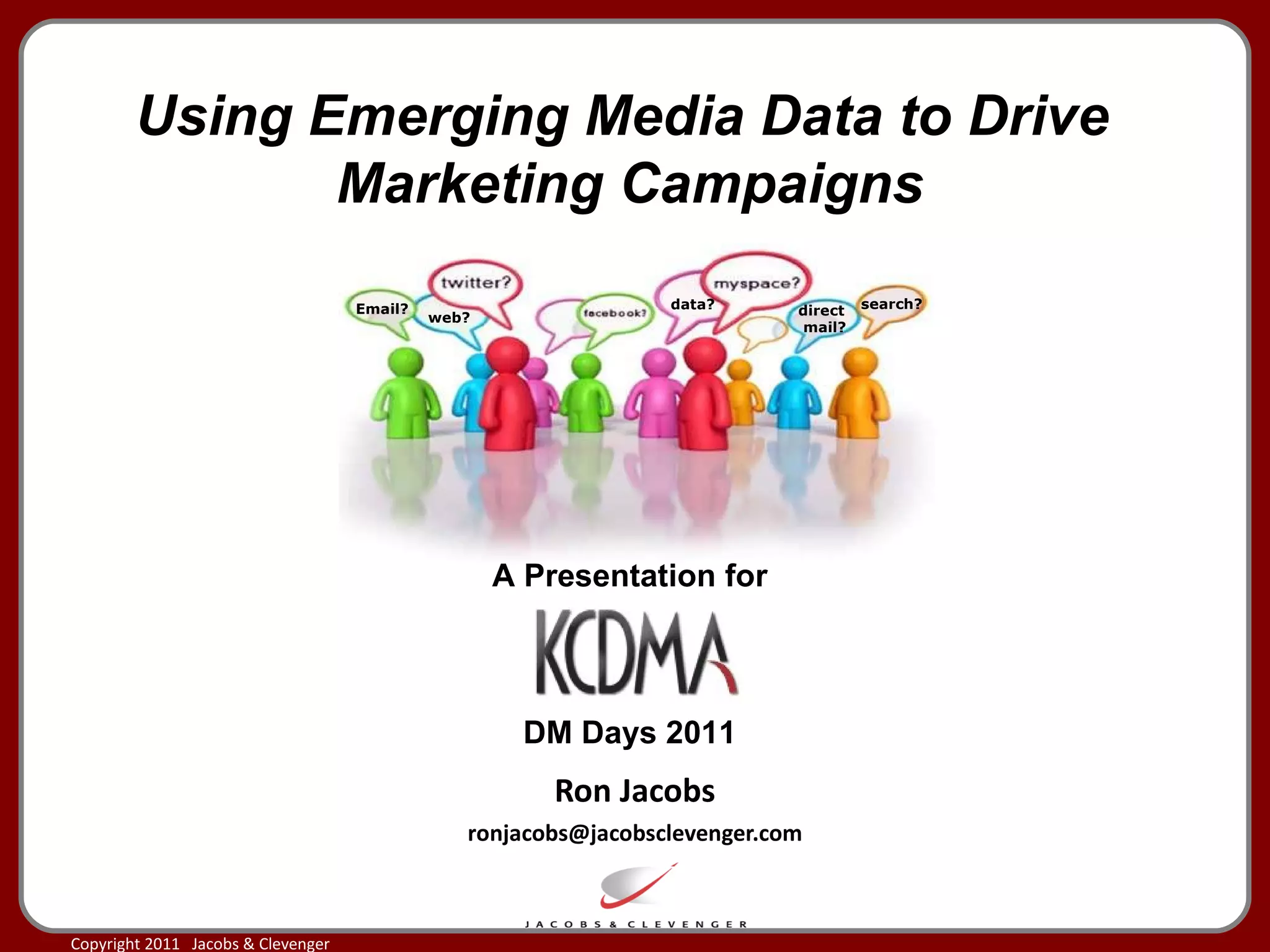 Ron Jacobs presented on using emerging media data to drive marketing campaigns. He discussed how marketers can capture behaviors from digital and social media to identify influencers and understand consumers. Social media marketing differs from direct marketing in being more conversational and transparent. Marketers need to show accountability and effectiveness through key performance indicators aligned with business goals. Social media is generating large amounts of data that can provide insights if analyzed properly.