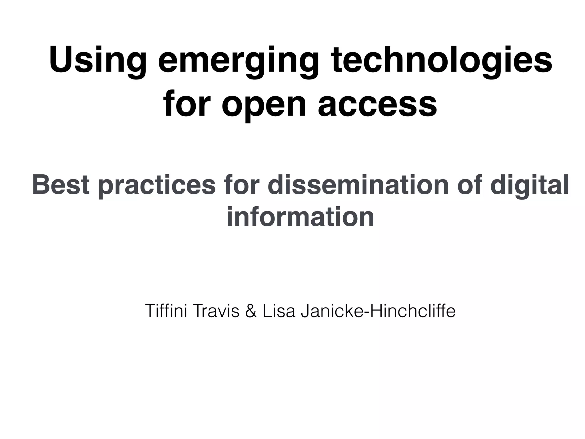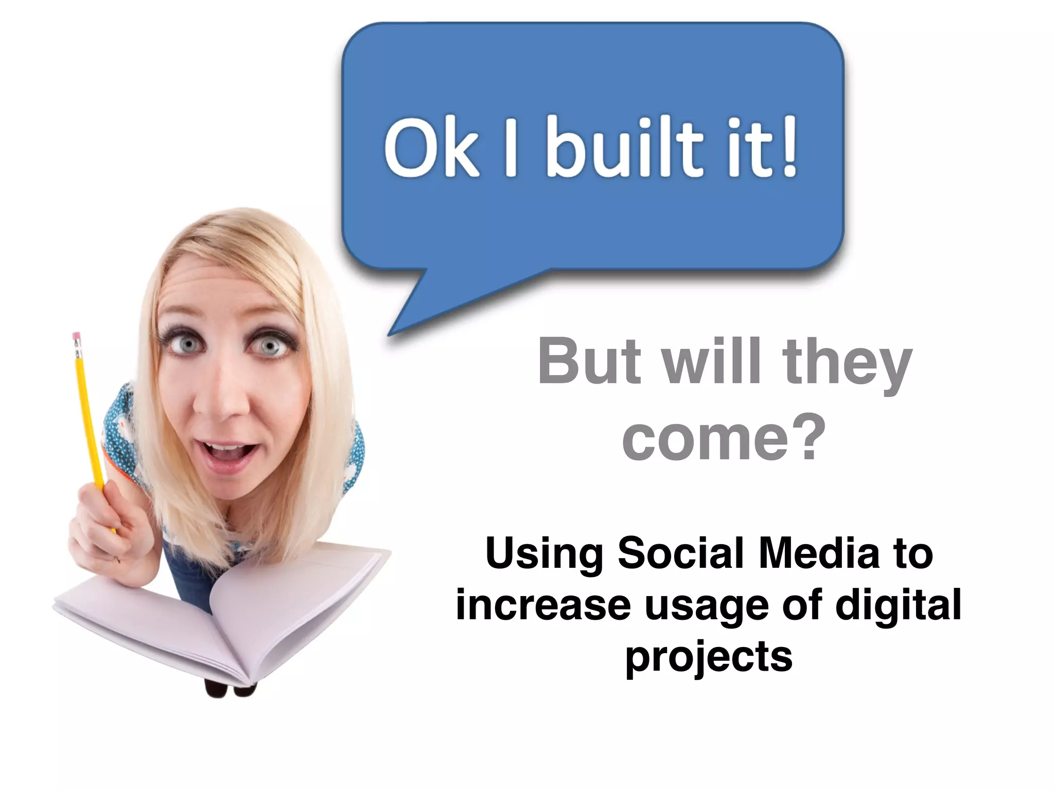 The document discusses the use of social media to enhance digital project engagement in libraries, focusing on objectives such as identifying tools, planning, and user understanding. It emphasizes the importance of knowing user demographics, engaging with them through various social media platforms, and employing strategies like QR codes and blogging. Additionally, it includes best practices for outreach, assessing progress, and utilizing SWOT analysis for effective outreach tool selection.