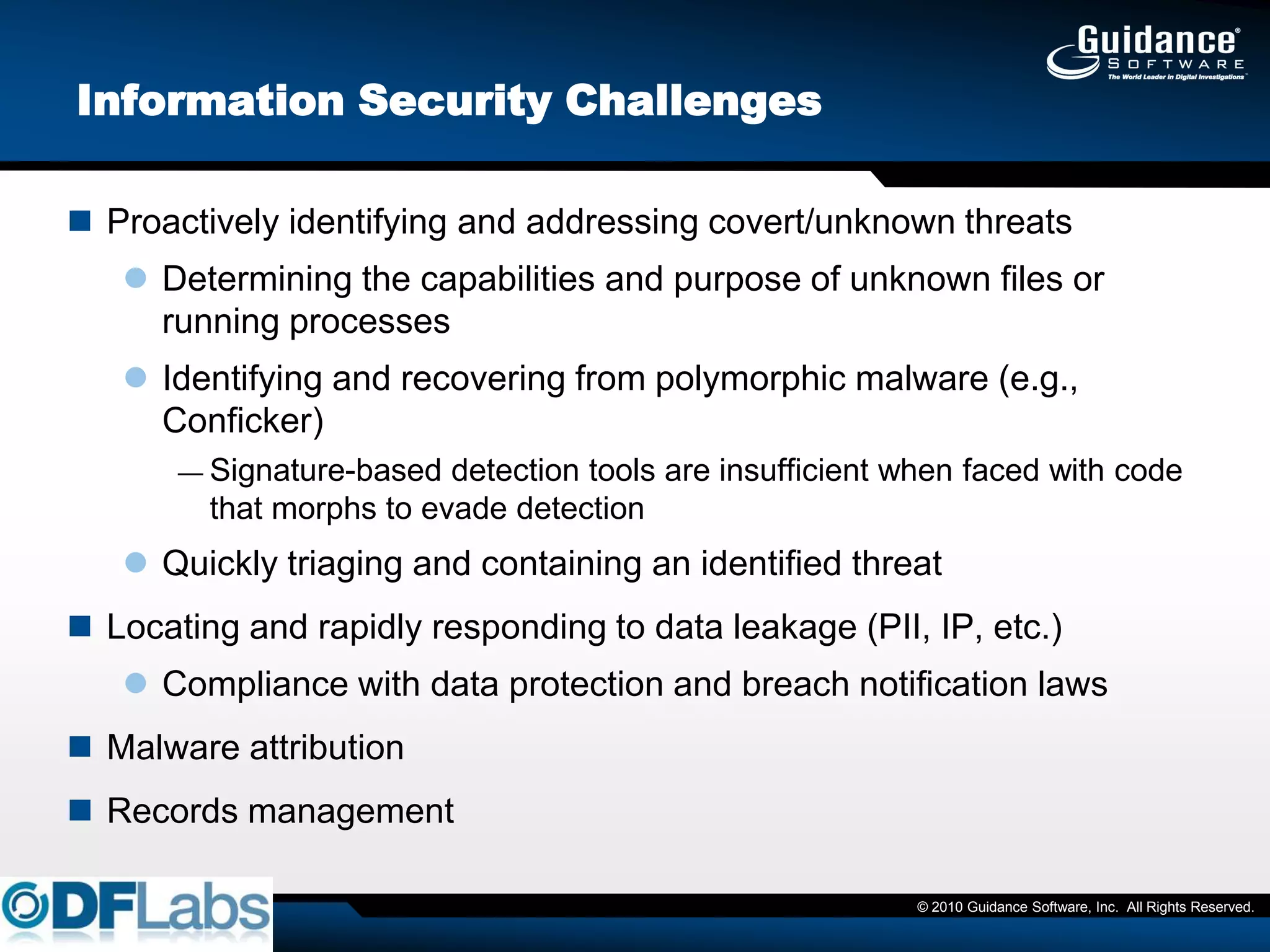 The document discusses the challenges and methodologies in cybersecurity, particularly in identifying and recovering from covert threats like polymorphic malware, which evades traditional detection methods. It introduces concepts such as fuzzy hashing and entropy analysis to enhance detection capabilities. Additionally, it emphasizes the importance of compliance with data protection laws and the need for effective risk management and data protection strategies.