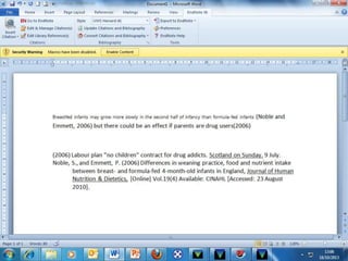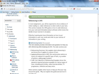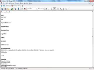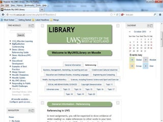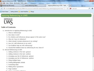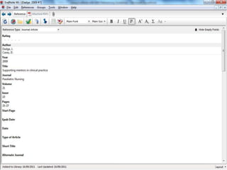 EndNote is a referencing software that allows users to import references from bibliographic databases, organize references in one place, and generate bibliographies in different formats. At the University of Western Scotland, EndNote is the preferred referencing software and is available to download and install on campus computers and through instructions on library websites. When first accessing EndNote, users can begin building their libraries by adding references and creating smart groups to organize their references.