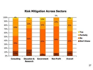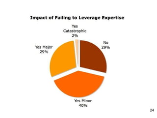 The document discusses a research project on how organizations manage expertise. The project uses narrative collection, workshops, and an online survey to understand challenges in expertise management. Over 180 stories have been collected from the project blog. Workshops have been conducted in several countries. The survey has received 132 responses so far, mostly from knowledge management and related fields in public sector, consulting, and education. Preliminary findings suggest expertise is less valued in large public sector organizations and there are regional differences in expertise challenges.