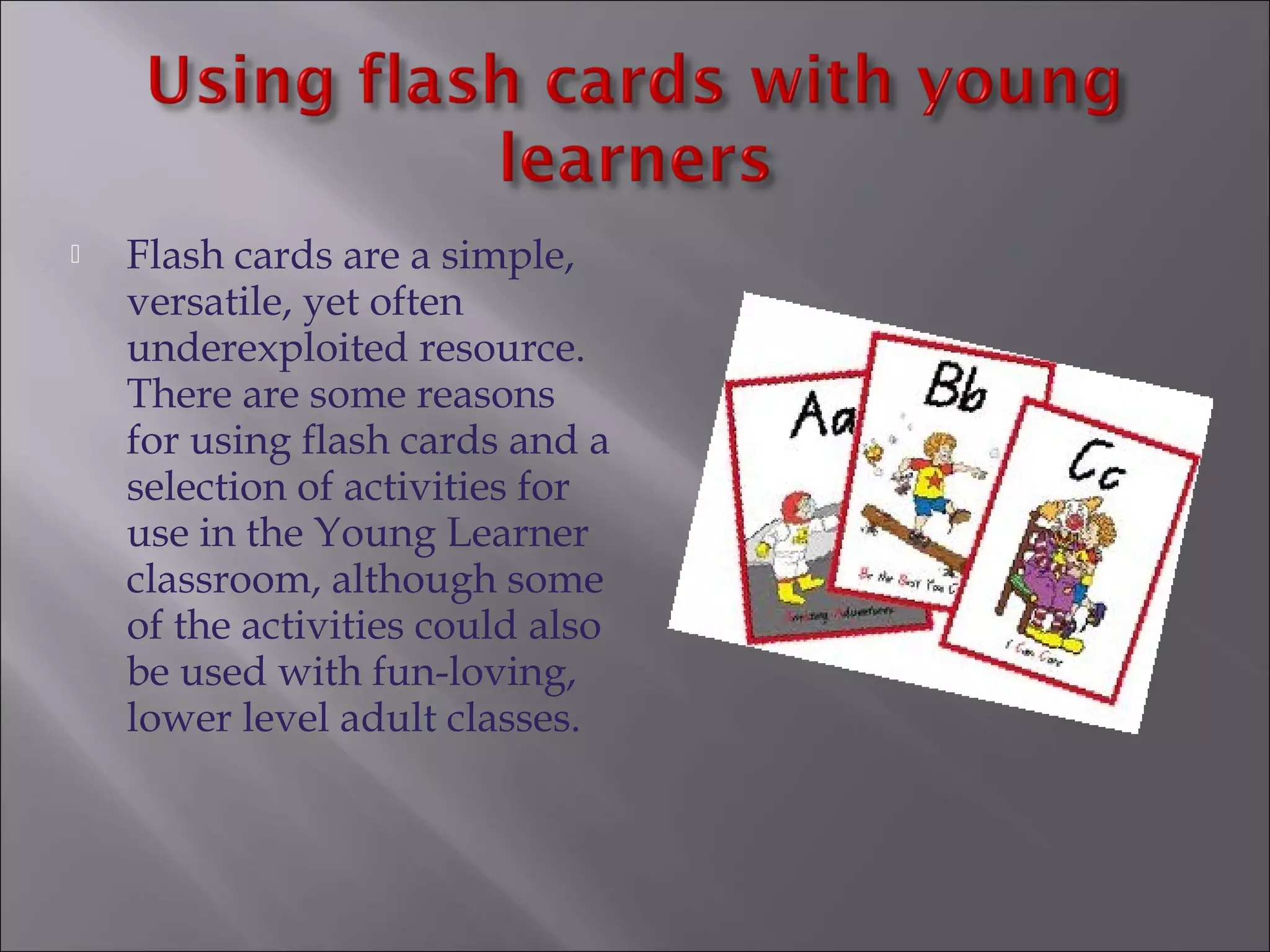 Flash cards are a simple yet versatile teaching tool for young learners and lower level adult classes. They can be used to present, practice, and recycle vocabulary through various memory, drilling, identification, and movement activities. Teachers can buy pre-made flash cards, make their own, or have students create cards to reinforce lexical sets introduced in class. Common games include having students memorize and recall cards, play matching games in small groups, pass cards around in a circle while identifying them, and incorporate cards into movement games like Simon Says.