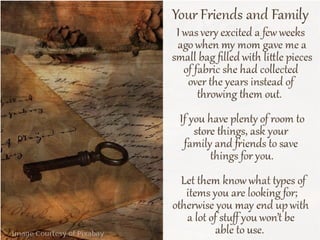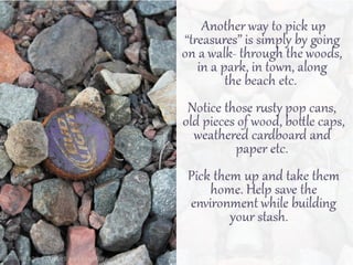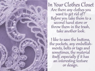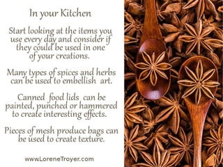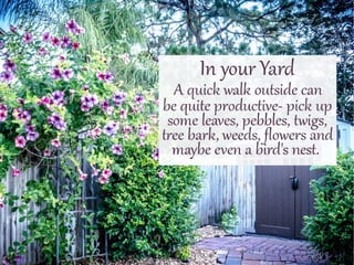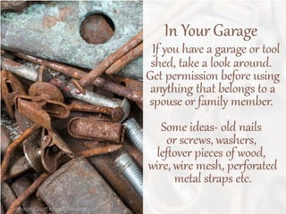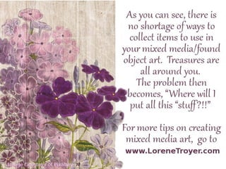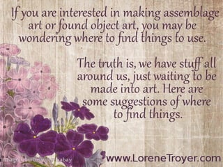 The document provides an extensive list of places to find materials for assemblage and found object art, emphasizing everyday locations like kitchens, garages, and gardens. It encourages collecting items such as old clothes, packaging, and nature-inspired materials, and suggests asking friends and family for discarded items. Additionally, the author mentions thrift stores and yard sales as great resources for unique artistic treasures.