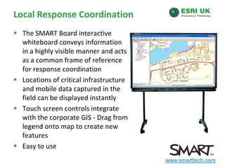 The document discusses the importance of Geographic Information Systems (GIS) in managing flood risks in England and Wales, emphasizing the need for local authorities to adopt GIS for effective flood management. It outlines new responsibilities for local authorities under the Floods and Water Management Bill, including the creation and maintenance of sustainable drainage systems. Additionally, it highlights the integration of GIS into various processes for preparing, analyzing, and sharing flood risk information to enhance decision-making and emergency planning.