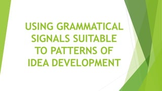 This document discusses the use of grammatical signals to connect ideas and develop patterns of thought in writing. It focuses on the general-to-particular pattern, where a composition begins with a broad general statement and uses specific details and examples to support and explain the general idea. Grammatical signals like "such as", "for example", "for instance", and "namely" can be used to smoothly connect the general statements to the specific supporting details in a way that maintains coherence and clarity for the reader.