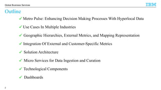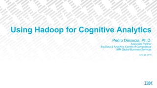 Using Hadoop for Cognitive Analytics discusses using Hadoop and external data sources for cognitive analytics. The document outlines solution architectures that integrate external and customer-specific metrics to improve decision making. Microservices are used for data ingestion and curation from various sources into Hadoop for storage and analytics. This allows combining business metrics with hyperlocal data at precise locations to provide insights.