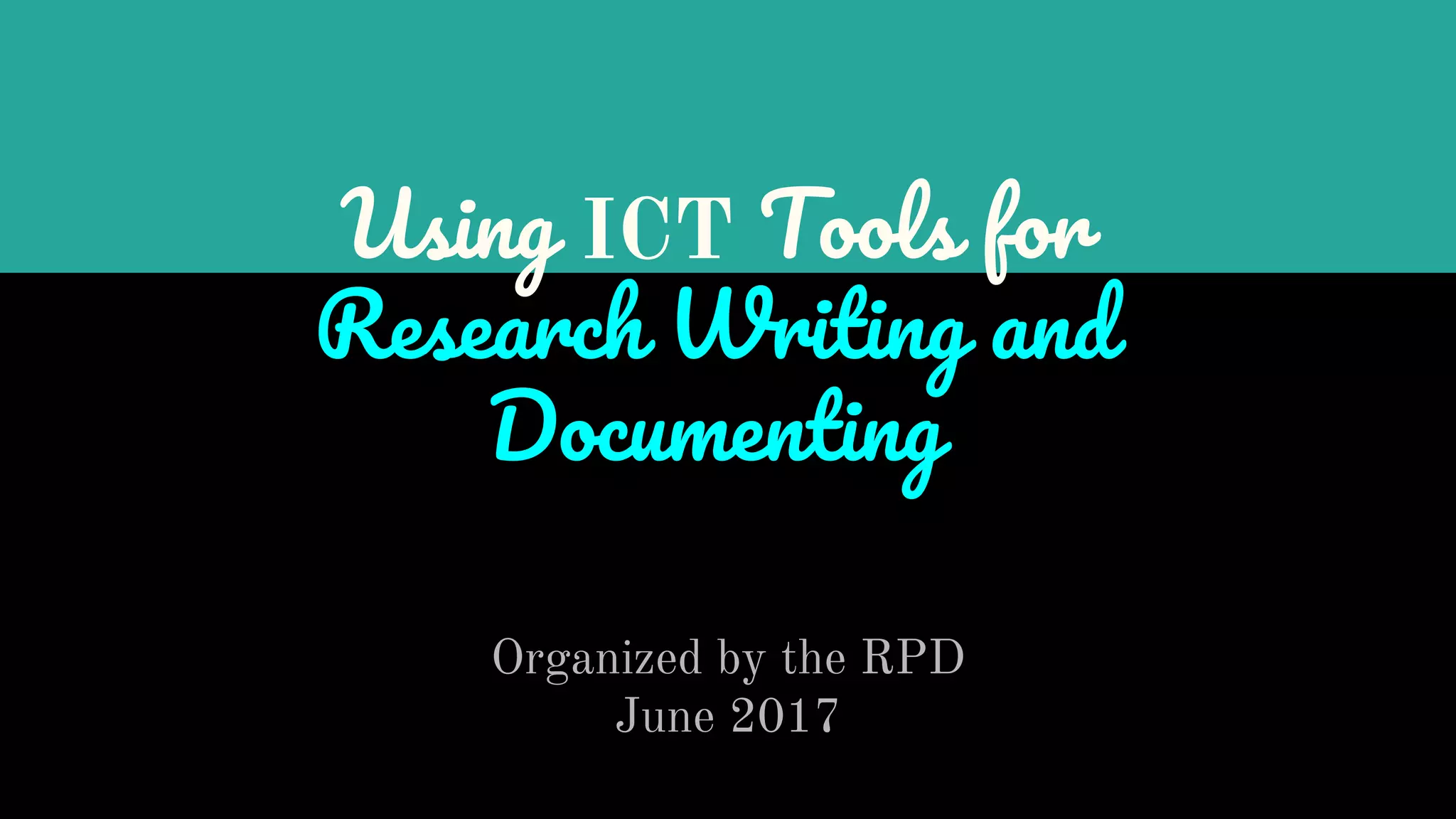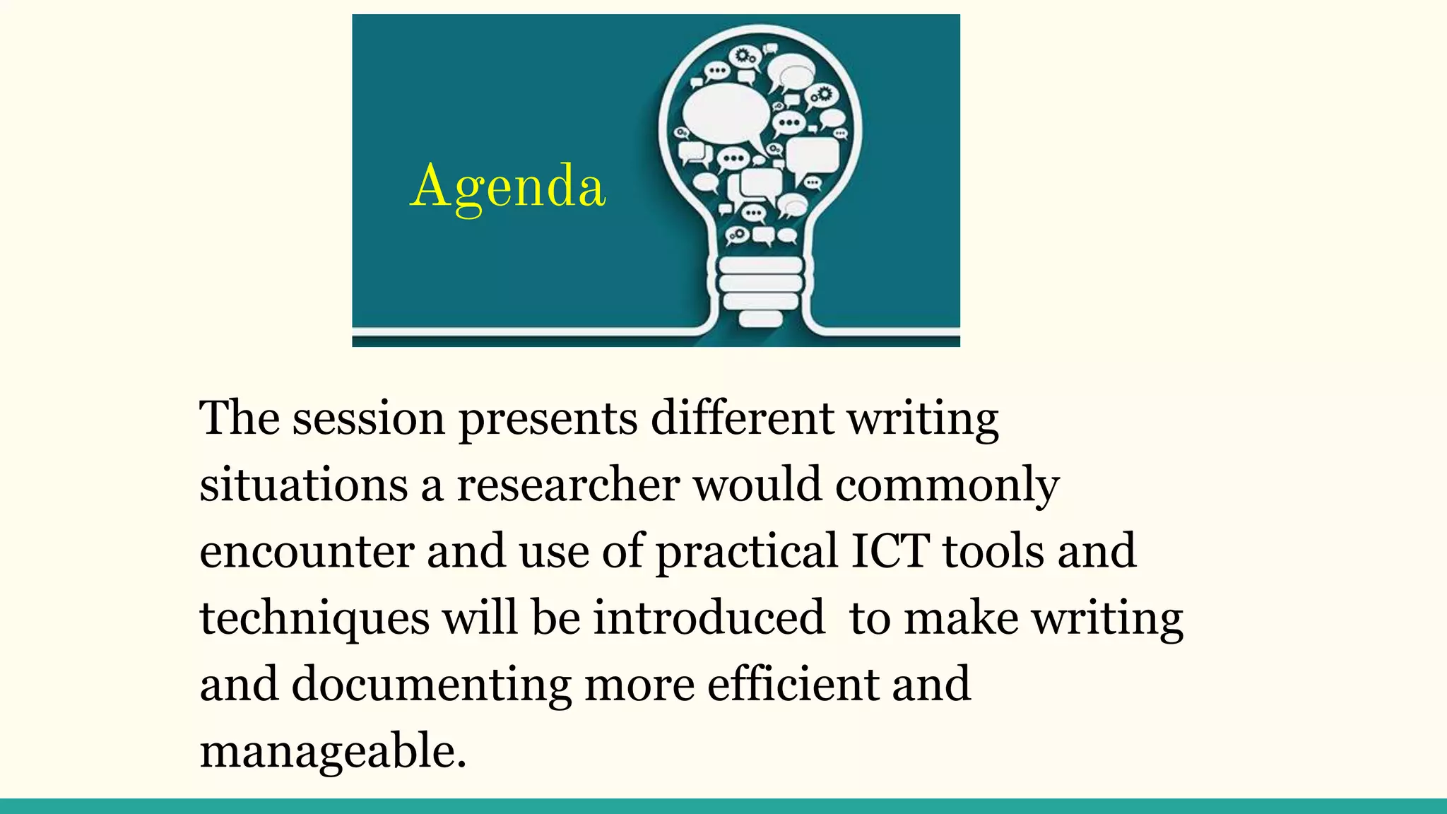 The document discusses using ICT tools to aid in research writing and documentation. It provides scenarios demonstrating how to use tools like MS Word citations, footnotes, endnotes, and auto-text to insert frequently used terms. It also addresses how to find and reuse images and diagrams, and how to translate websites into other languages using tools like Google Translate.
