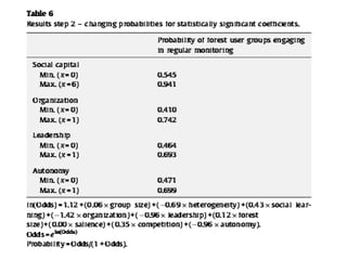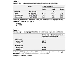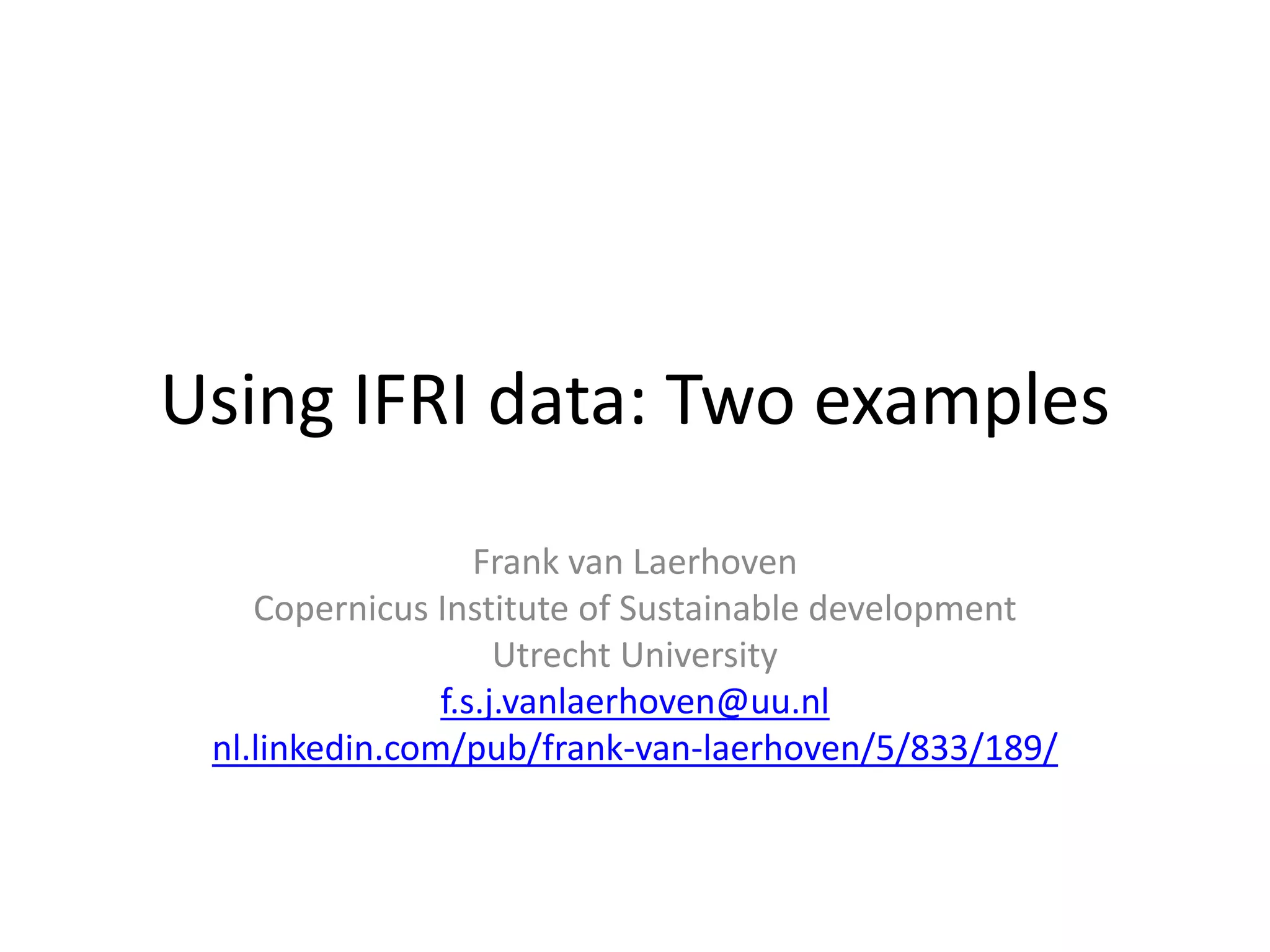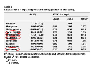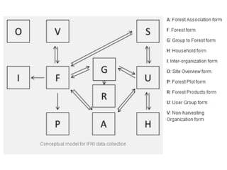 The document discusses the use of data from the International Forestry Resources and Institutions (IFRI) research program to study community forest governance. It provides two examples of papers by the author that use IFRI data to examine factors influencing collective action in forest management. The first paper analyzes conditions under which forest user groups engage in monitoring activities. The second examines the relationship between conflict and collective action, finding that groups experiencing more conflict can still successfully govern forests. The document outlines the theoretical frameworks and hypotheses for each paper.