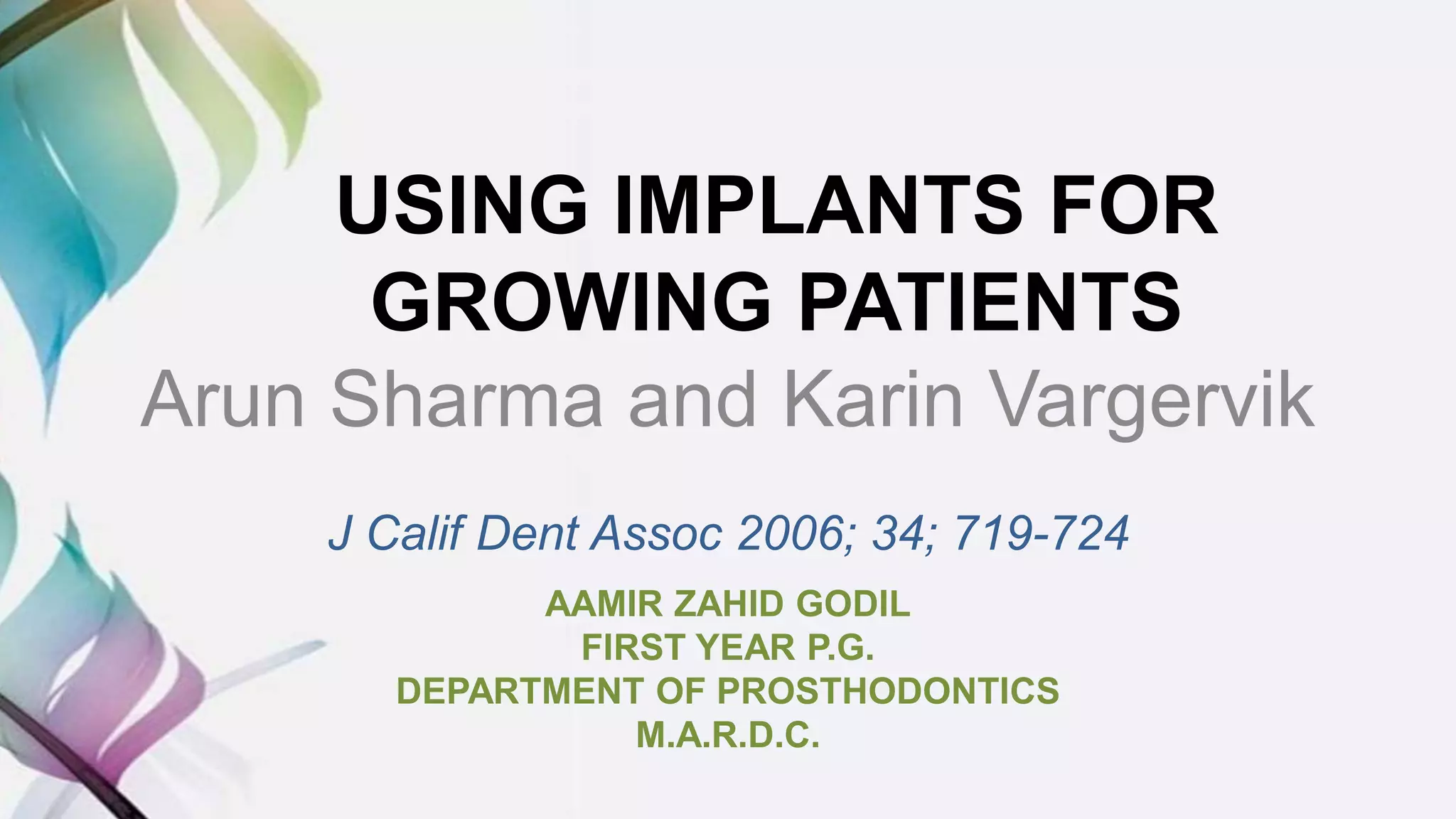 This document discusses the use of dental implants for growing patients. It outlines concerns about implant placement interfering with jaw growth and tooth eruption. Case reports show implants becoming submerged or misaligned due to residual growth. The youngest child reported with implants was 1.5 years old. Recommendations include not placing implants before age 6, and waiting until growth is nearly complete, usually around 17 years old. Exceptions may be made for patients with complete anodontia. Regular prosthesis adjustments are needed to account for jaw growth.