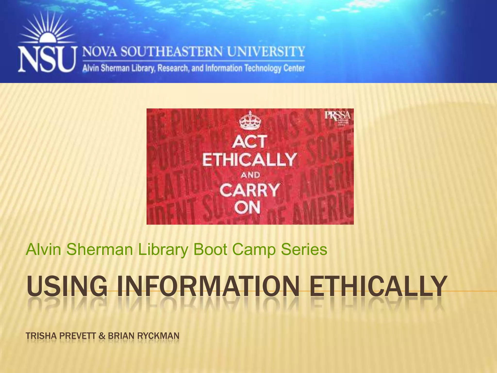This document provides information on using information ethically. It discusses evaluating sources using the CRAAP test to determine credibility. It explains why sources should be cited, including to give credit and allow readers to find sources. The document defines plagiarism and self-plagiarism and notes plagiarism can have serious consequences. It demonstrates how to cite sources in-text and in reference lists using both APA and MLA styles.
