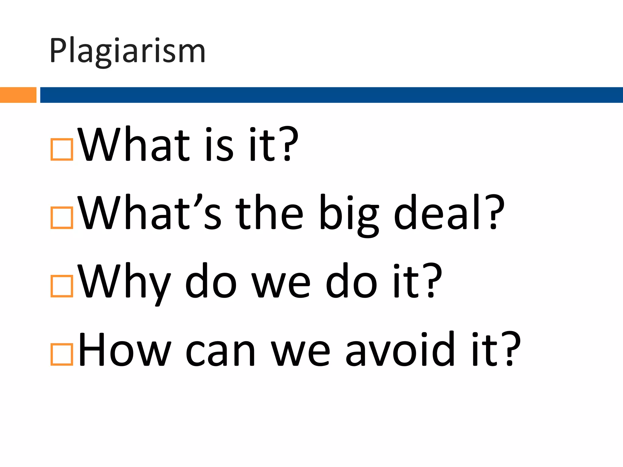 The document discusses plagiarism, including what it is, why it is problematic, reasons why students may plagiarize, and how to avoid it. It provides examples of plagiarism in the news and poses quiz questions about whether certain actions constitute plagiarism or not, followed by explanations. The document emphasizes the importance of properly citing sources to avoid plagiarism.