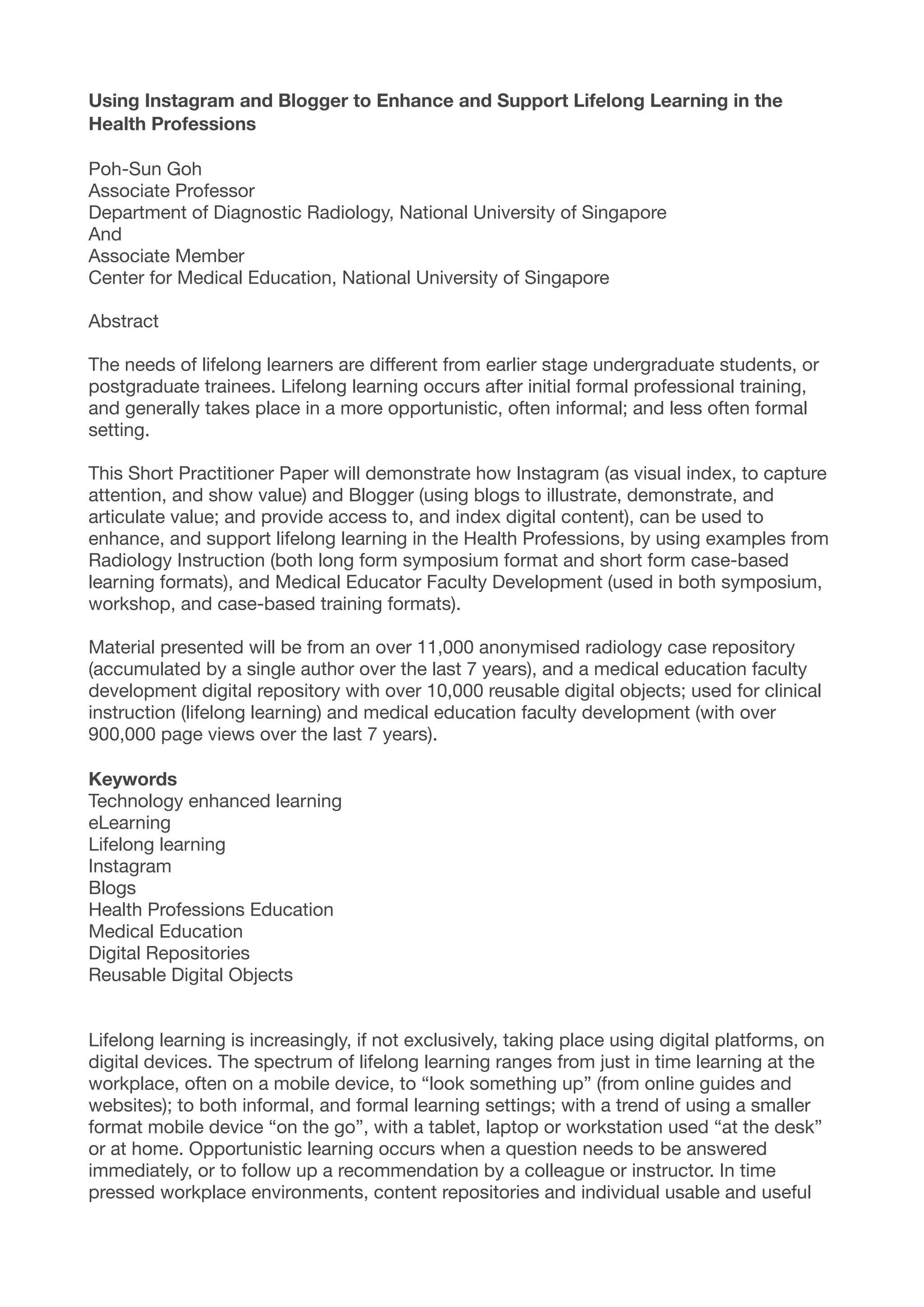 This document discusses how Instagram and blogging platforms like Blogger can be used to enhance lifelong learning in health professions. It describes using Instagram to visually showcase content from an anonymized repository of over 11,000 radiology cases and a medical education digital object repository with over 10,000 reusable objects. Blogs provide a platform to illustrate concepts, share content before, during and after training, and engage audiences using tools like Padlet and discussions via WhatsApp. Content and outcomes can then be reflected on and customized to form an educational portfolio for faculty development.