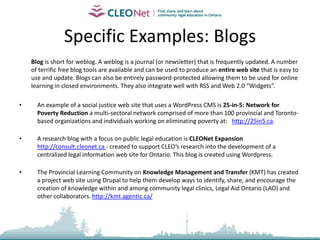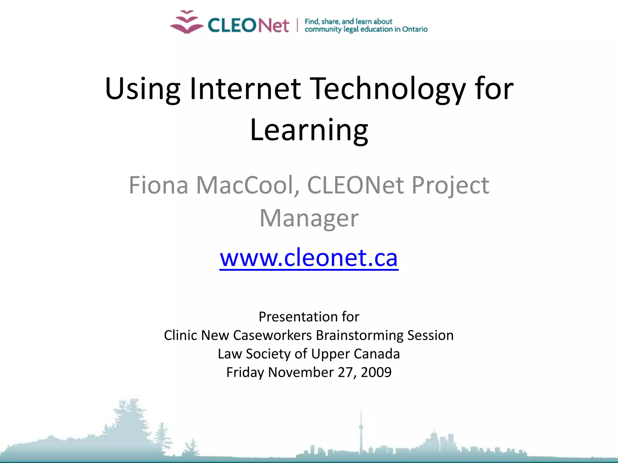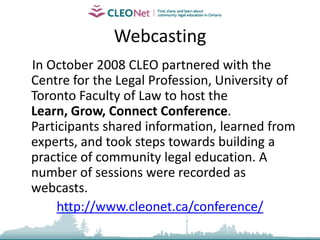 The document outlines strategies for utilizing internet technology in learning for new caseworkers, focusing on online courses, webinars, and collaborative web publishing. Key considerations include defining learning goals, audience characteristics, and resource availability, alongside examples of successful online initiatives and tools like Moodle and various social media platforms. It emphasizes the importance of engaging content and community interaction to enhance learning experiences in legal education.