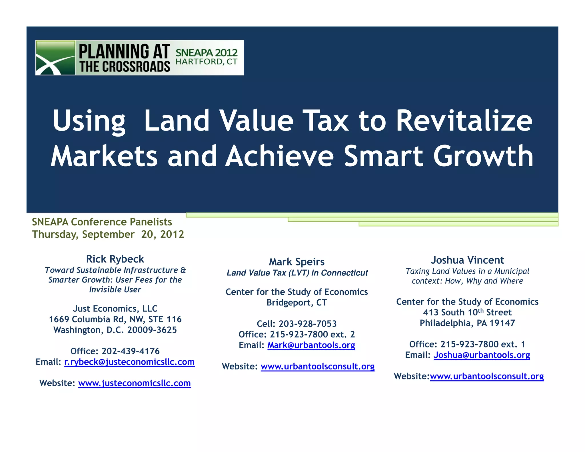 This document discusses using land value tax and value capture to help fund infrastructure in a way that promotes smart growth. It notes that traditional infrastructure funding through user fees and taxes can encourage sprawl. Land value tax and value capture systems recoup some of the increase in land value from public infrastructure investments, distributing the costs more equitably among beneficiaries. This approach can incentivize more efficient land use patterns by encouraging development near existing infrastructure.