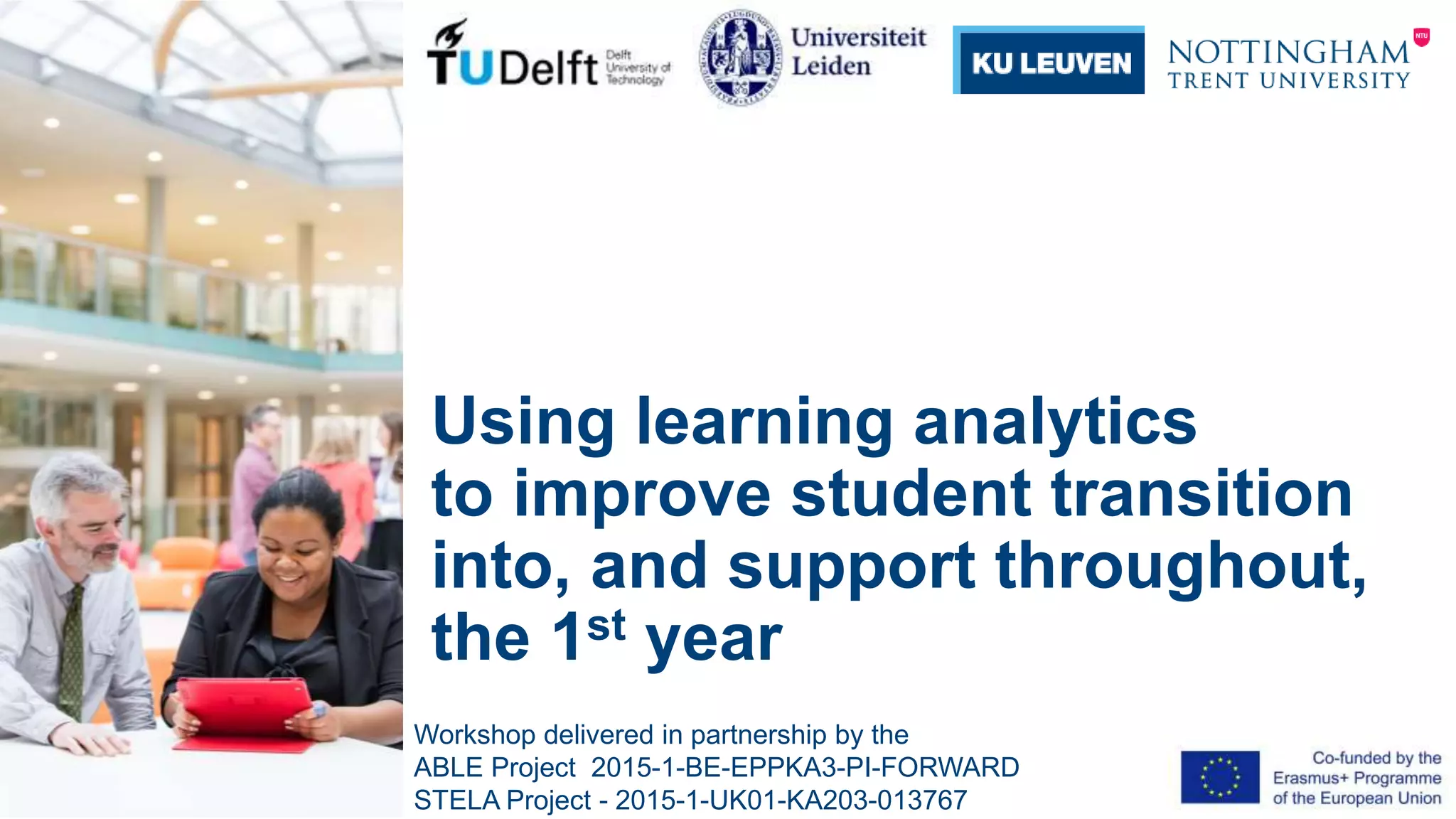 This document provides an overview of a workshop on using learning analytics to improve student transition and support in the first year. The workshop was delivered by the ABLE and STELA projects in partnership.