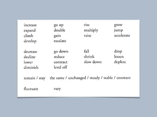 The document outlines the purpose, creation, and interpretation of line graphs, emphasizing their ability to display relationships between two variables and identify trends over time. It discusses various types of line graphs, such as basic and multiple, and provides guidance on how to effectively present and analyze data. Additionally, it highlights key questions to consider when describing changes depicted in line graphs, using the sales trends of Chevrolet Camaro and Ford Mustang as an example.