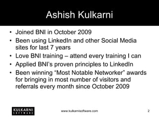 The document outlines how to effectively use LinkedIn in conjunction with BNI to invite visitors and generate referrals, emphasizing the advantages of LinkedIn over traditional methods. It details strategies for optimizing one's LinkedIn profile, expanding a network, and leveraging the platform's features to enhance business and referral opportunities. The author, Ashish Kulkarni, highlights his successful experience within BNI and offers personalized consulting services for utilizing social media for business growth.