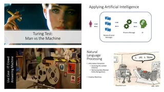 The document discusses using machine learning and chatbots for first line technical support. It defines what a chatbot is and provides examples like the Turing test. Chatbots are useful for customer service, technical support via answering frequently asked questions, and automating forms. The document outlines various chatbot platforms and architectures. It also provides an example use case of a chatbot for an IT help desk. The document discusses how natural language processing and classification algorithms can help chatbots understand language. Finally, it demonstrates how tools like LUIS can add intelligence to a technical support chatbot.