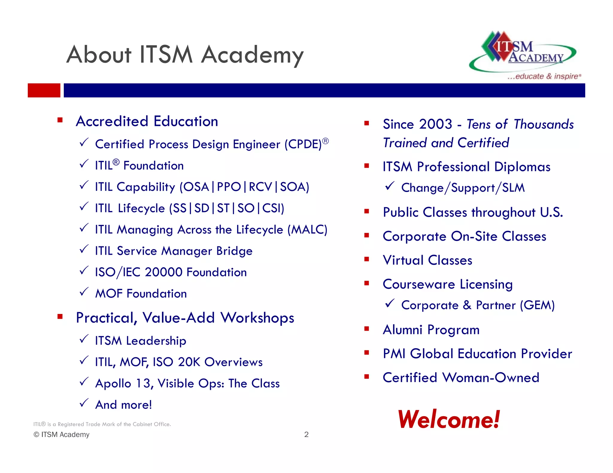 The document provides information about ITSM Academy, an accredited education provider that has trained tens of thousands in ITSM certifications and frameworks since 2003. It offers both public and private virtual and in-person training classes on topics including ITIL, ISO 20000, MOF and more. The academy also provides workshops, courseware licensing, and ITSM professional diplomas.