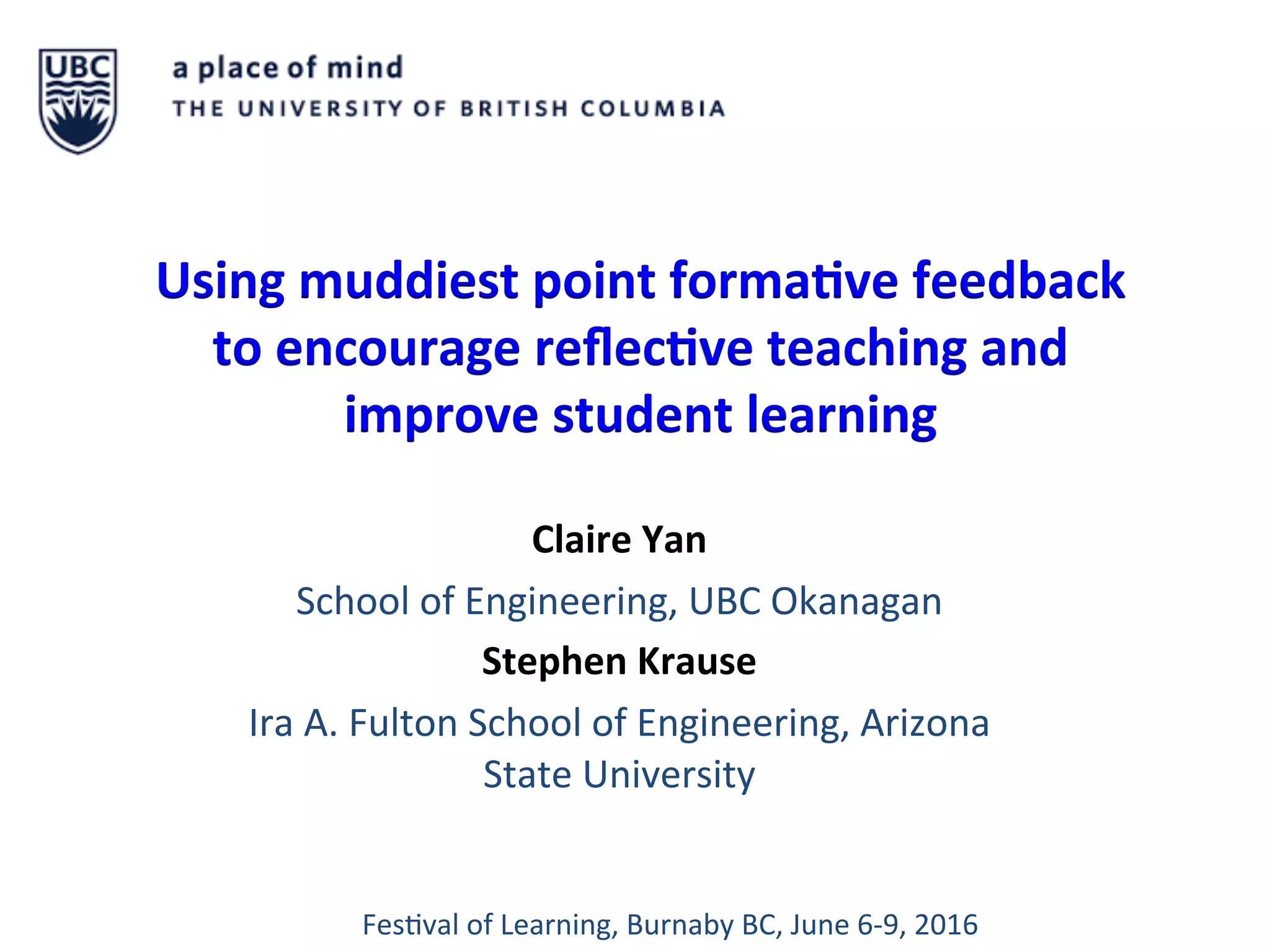 The document discusses the use of the Muddiest Point (MP) survey as a formative feedback tool to enhance reflective teaching and improve student learning outcomes. It details the implementation of this survey in engineering courses, highlighting its effectiveness in identifying student confusion and facilitating instructor adjustments. The findings indicate that utilizing the MP approach fosters a more student-centered pedagogy and boosts students' engagement and responsibility for their learning.