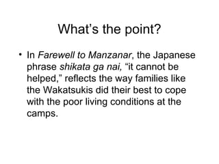 The Japanese phrase "shikata ga nai", meaning "it cannot be helped", reflects how families in the internment camps coped with poor conditions. In Ender's Game, Ender struggles with his identity compared to his violent brother Peter, seen when he cries after beating a bully but continues to face reminders of Peter. This internal conflict isn't resolved until the novel's end. The document discusses using examples in expository writing and different types of examples like quick references, "magic three" examples, and detailed examples.