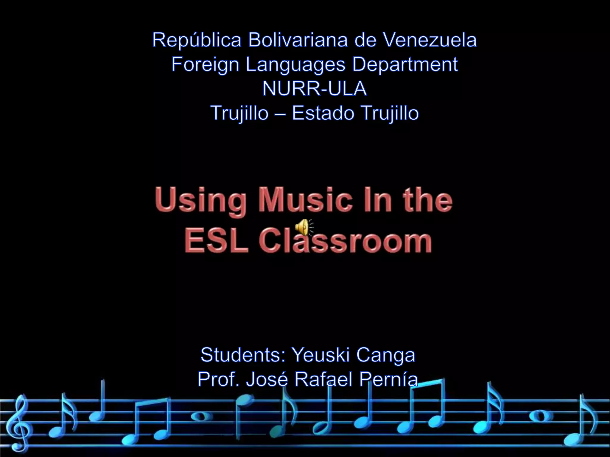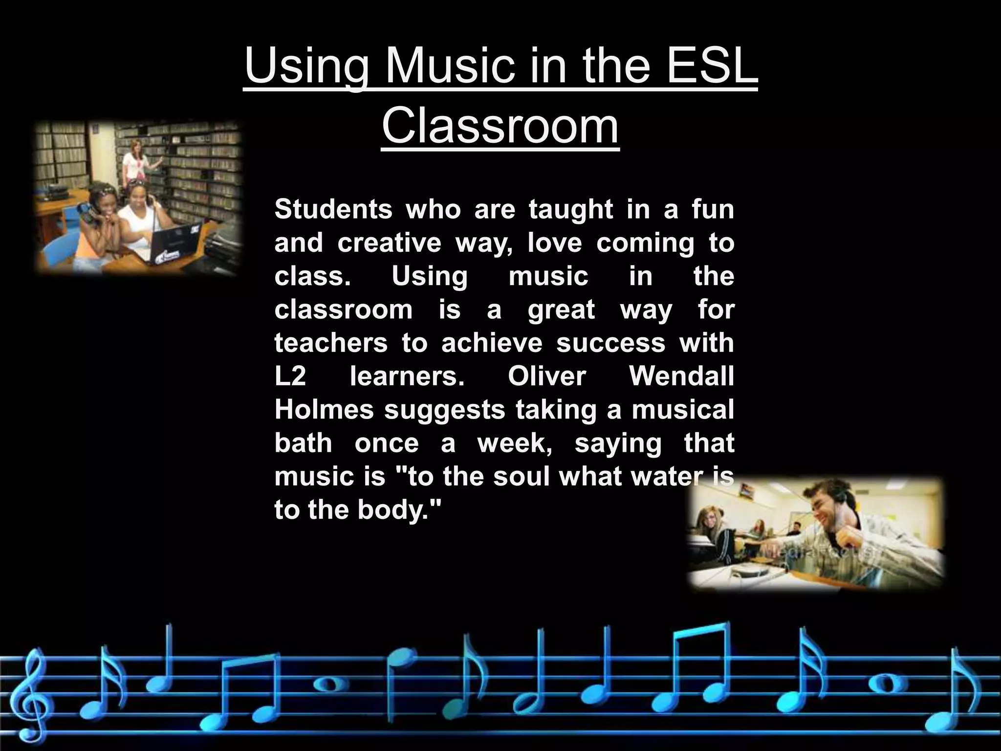 This document discusses the benefits of using music in the ESL classroom. It provides examples of how music can be used to introduce topics, build vocabulary, teach pronunciation, and make learning fun. Suggested activities include using background music, teaching songs about grammar rules and vocabulary, and having students create their own songs. The document also provides specific suggestions for using music to teach vocabulary and transitions to young students, including alphabet songs, animal songs, and encouraging student-led songs in their native language. Overall, the document advocates for incorporating music into ESL lessons to improve memory, concentration, motivation and make learning more enjoyable.