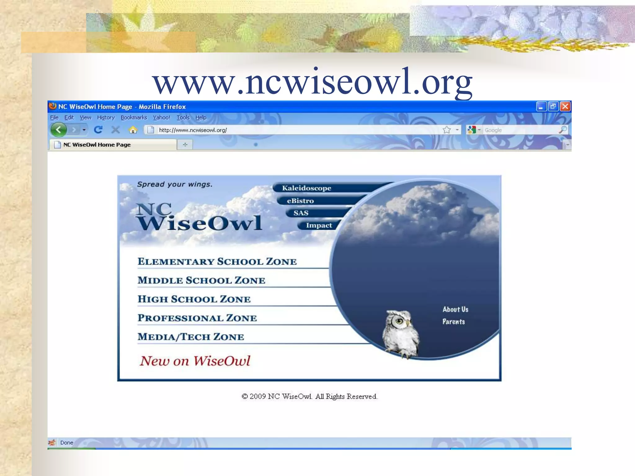 The document discusses NC WiseOwl, an initiative by the North Carolina Department of Public Instruction to provide online educational resources for students and teachers. It summarizes several resources available through WiseOwl, including Kaleidoscope for creativity and computer skills, SAS Curriculum Pathways for high school core subjects, Gale InfoBits for elementary research, and videos from PBS LearningMedia. The document emphasizes that WiseOwl provides a variety of up-to-date, age-appropriate, and engaging materials to help students learn 21st century skills in a safe online environment.