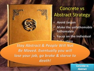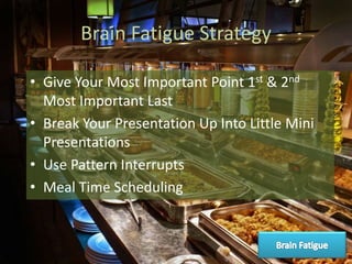 This document discusses strategies for pitching ideas to the human brain based on its cognitive biases. It begins by outlining the three main parts of the human brain: the neocortex for logic/abstract thought, limbic system for emotions/empathy, and reptilian complex for survival/reproduction. It then notes that humans make rational decisions irrationally based on seven biases: avoiding pain/death, being self-absorbed, seeking the familiar, preferring concrete examples over abstract concepts, thinking in black-and-white terms, relying on relativity to make judgments, and relying heavily on visual processing. The document provides specific strategies to address each of these biases when presenting new ideas or concepts to appeal to the human brain.