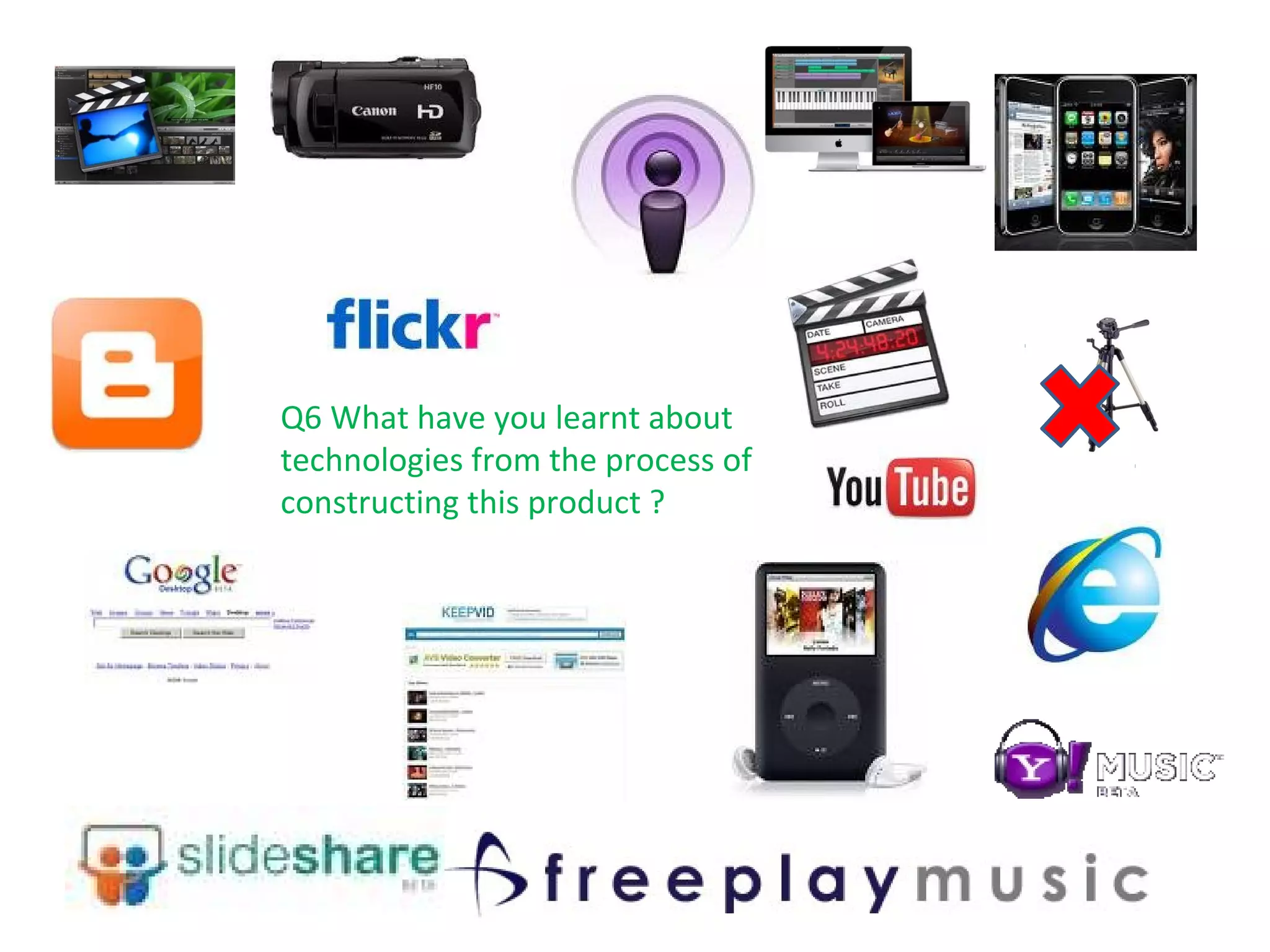 The document discusses various technologies and processes used in constructing a music video or other media product. It lists examples of research activities conducted using new media technologies, such as searching for similar films online and looking at album release posters. Planning activities are also discussed, including uploading schedules, storyboards, and filming locations. The construction and evaluation process involved uploading various works-in-progress and final versions to YouTube and Flickr. New media technologies allowed referencing and comparing other works online.