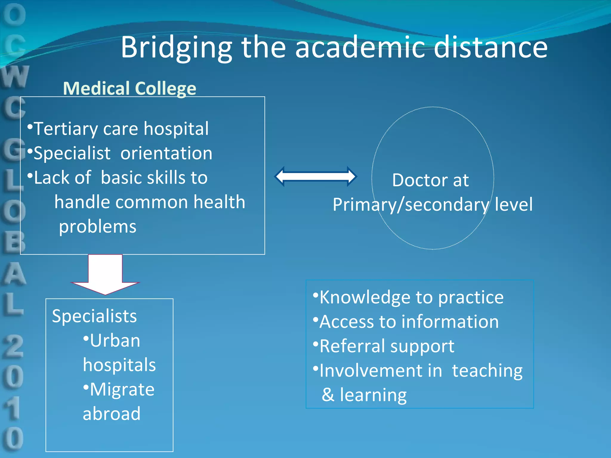 This document discusses using e-learning to support medical education and healthcare delivery at secondary hospitals in rural India. It outlines CMC Mission Hospitals' existing e-learning linkage and a needs assessment survey that found secondary hospitals have the infrastructure to access e-learning resources. The document proposes developing e-learning projects to provide clinical resources, guidelines, and networking opportunities to isolated hospitals. It envisions selecting some medical students from local communities and having them do part of their training at primary and secondary sites, with technology platforms and mentors supporting distributed education.
