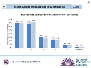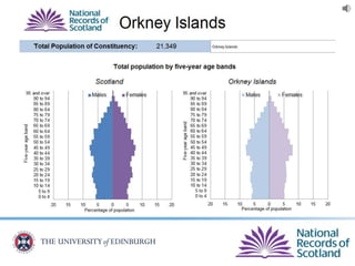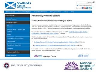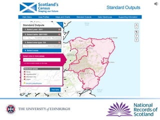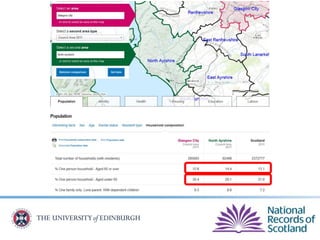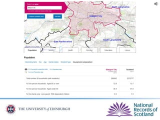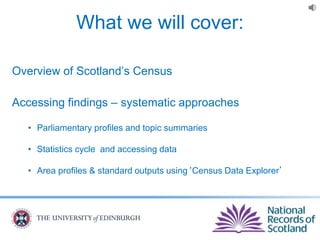 The document provides an overview of Scotland's census, emphasizing the importance of census data in understanding population dynamics, including education, ethnicity, health, and housing. It highlights key findings from the 2011 census, such as the increase in the population and the prevalence of one-person households. Additionally, it outlines systematic approaches for accessing census data, including use of the 'census data explorer' and various statistical techniques.