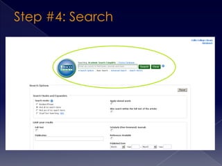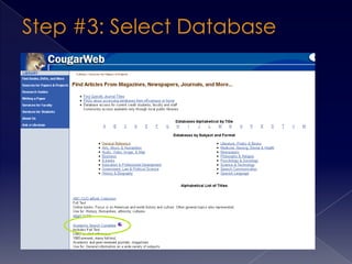 This document provides instructions for searching academic databases and recording sources. It recommends selecting the "Full Text" and "Scholarly (Peer Reviewed)" options before searching, using the automatic citation function to record sources, and creating a works cited list as articles are found to make the research process more organized.