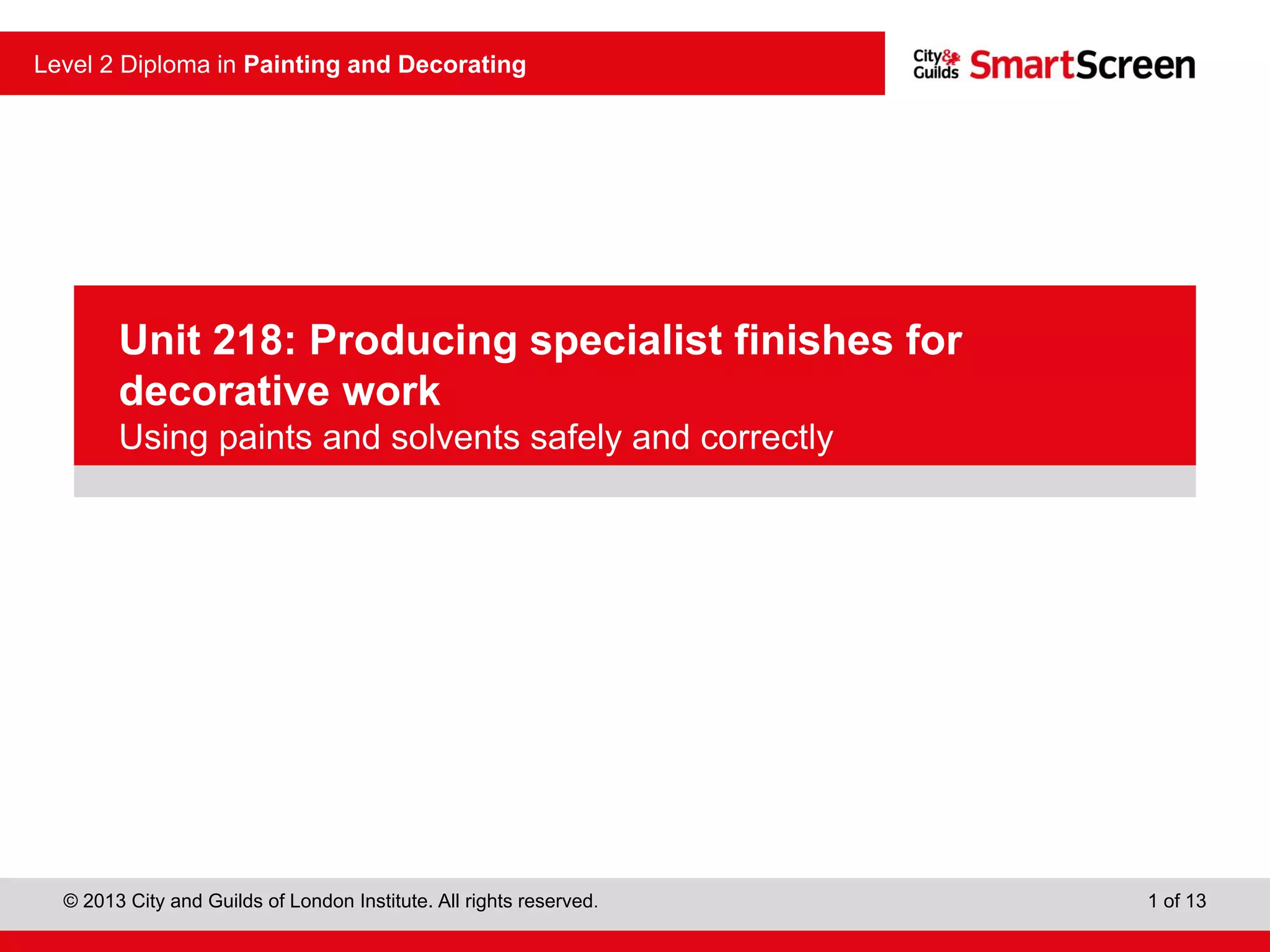 This document discusses hazards and safety precautions related to different types of paints used for decorative work. It addresses hazards from oil-based, spirit-based, and water-based paints which can include fumes, skin problems, and fire. The document recommends using personal protective equipment (PPE) like gloves, masks, and barrier creams to prevent these hazards. It also stresses the importance of proper ventilation, hygiene, and storage practices when working with paints.