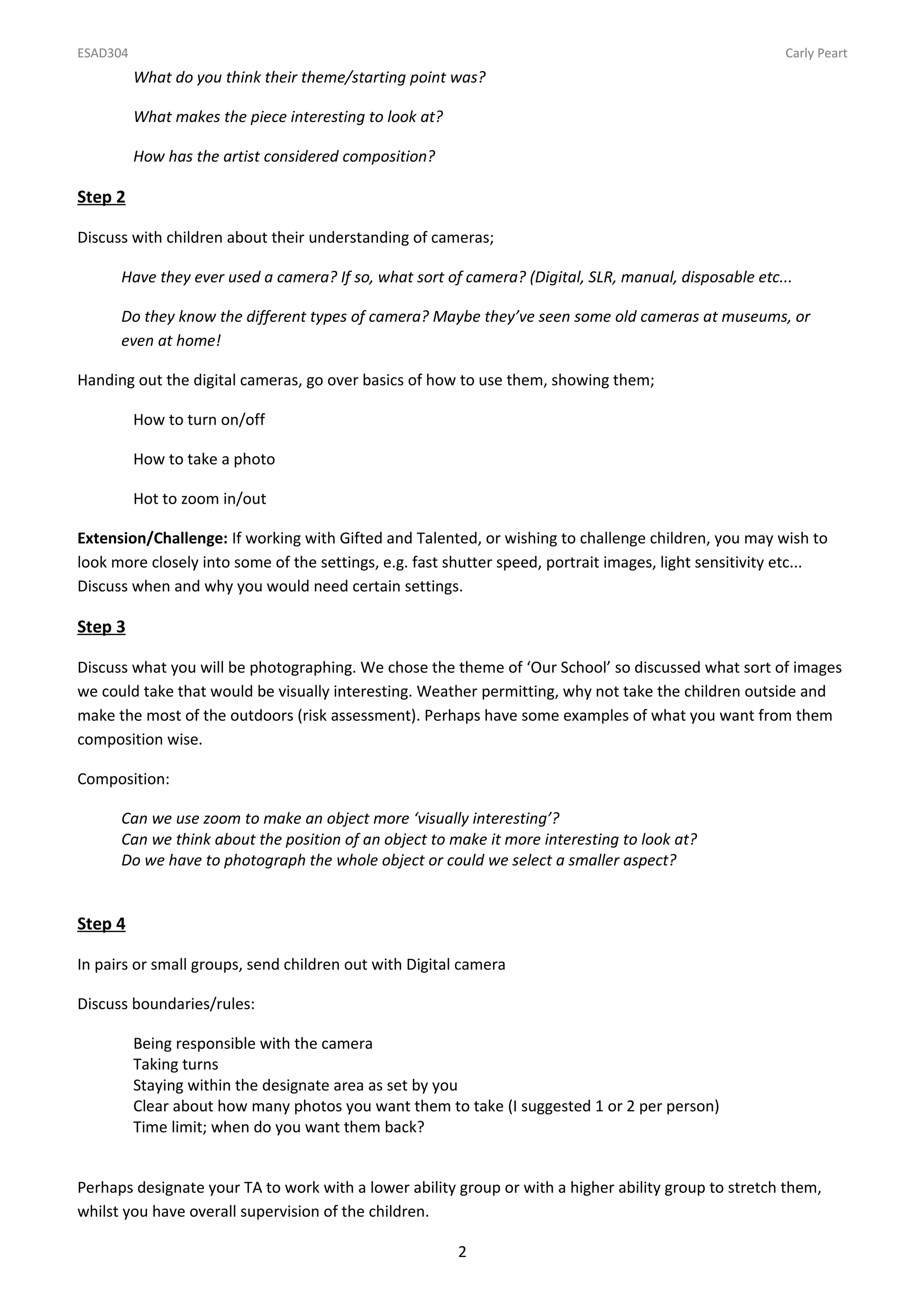 This document provides instructions for a photography art project that can be done with students in Key Stage 2. It involves looking at example artworks, learning about cameras, taking photos around the school, manipulating the photos digitally, and further developing the compositions in sketchbooks. The project is designed to be completed over multiple sessions or condensed into a longer session. It aims to teach students photographic composition and digital editing skills while exploring themes from example artworks.