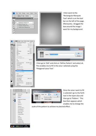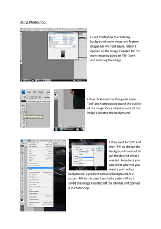 The document describes using Photoshop to edit images for a front cover. It outlines selecting the main image using the Polygonal Lasso Tool, filling the background with a pattern by defining the pattern and selecting it, and resizing the pattern using the layers box to achieve the desired effect.