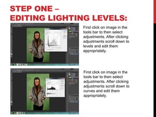 This document provides steps for editing images using Photoshop. It outlines five steps: 1) Editing lighting levels using the levels adjustment, 2) Editing color balance using the hue/saturation adjustment, 3) Adding photo filters, 4) Removing backgrounds using the magic wand and eraser tools, and 5) Further editing like spot healing, burning, smudging and sharpening. It also describes how to change the background using the paint bucket tool and finish by adjusting exposure and contrast.