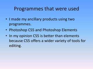 The document discusses how the author used Photoshop CS5 to create ancillary music products like a digipak and advert. Key techniques included using the pen tool to select an artist from a background, adjusting contrast and colors, applying displacement and selective color features, and properly arranging layers and fonts. Photoshop offered many tools that helped the author develop their ideas and produce finished products they were satisfied with, though it took practice to learn the program.
