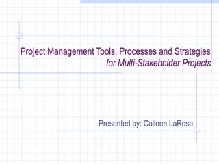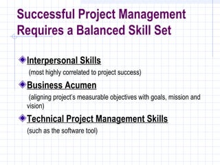This document discusses project management strategies for multi-stakeholder projects. It emphasizes that successful project management requires a balanced set of interpersonal, business, and technical skills. It also stresses the importance of establishing clear goals, developing efficient processes, driving effective outcomes, and creating sustainability from the beginning to ensure efforts can continue after grant funding ends. A variety of project management software and tools are presented, along with guidance on choosing options based on the specific project's needs and goals.