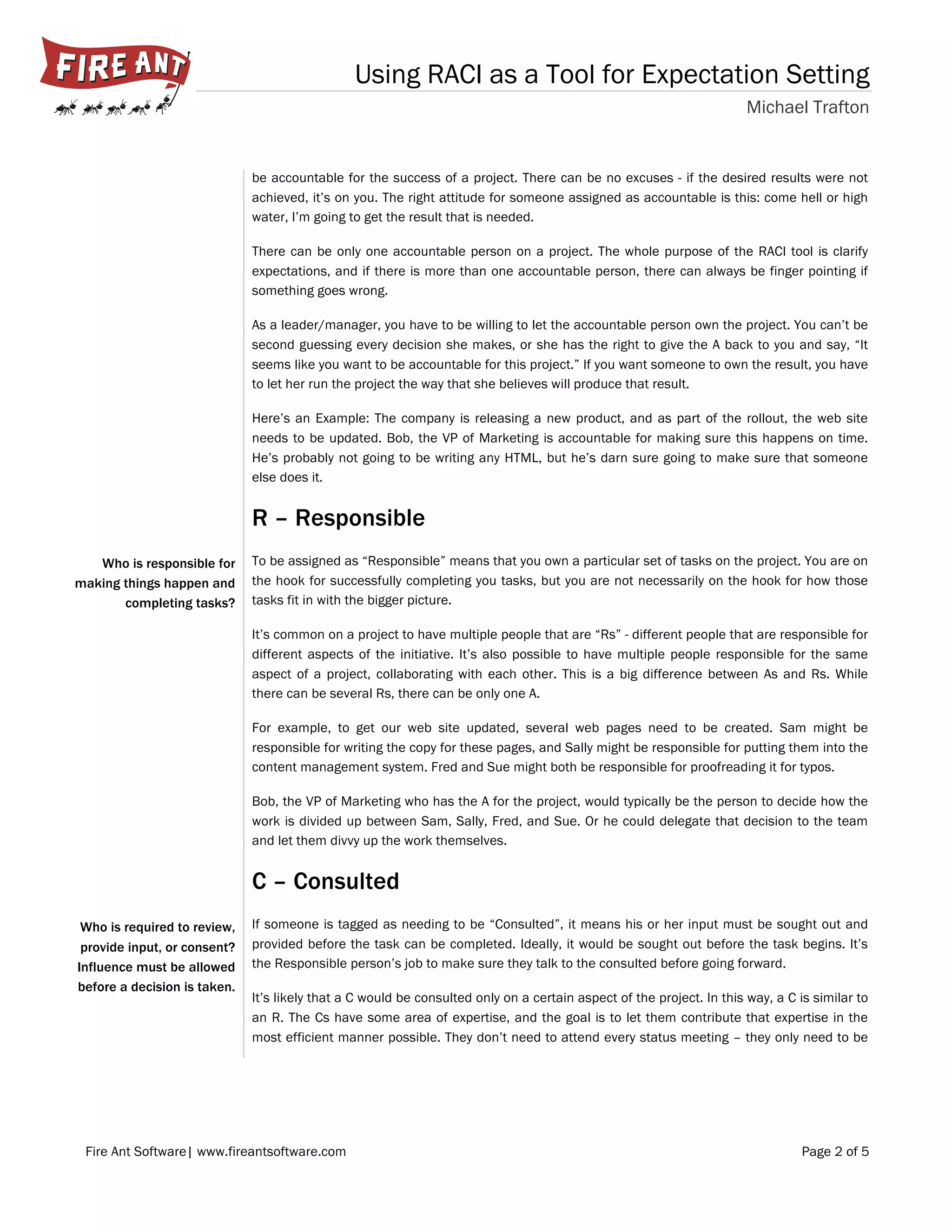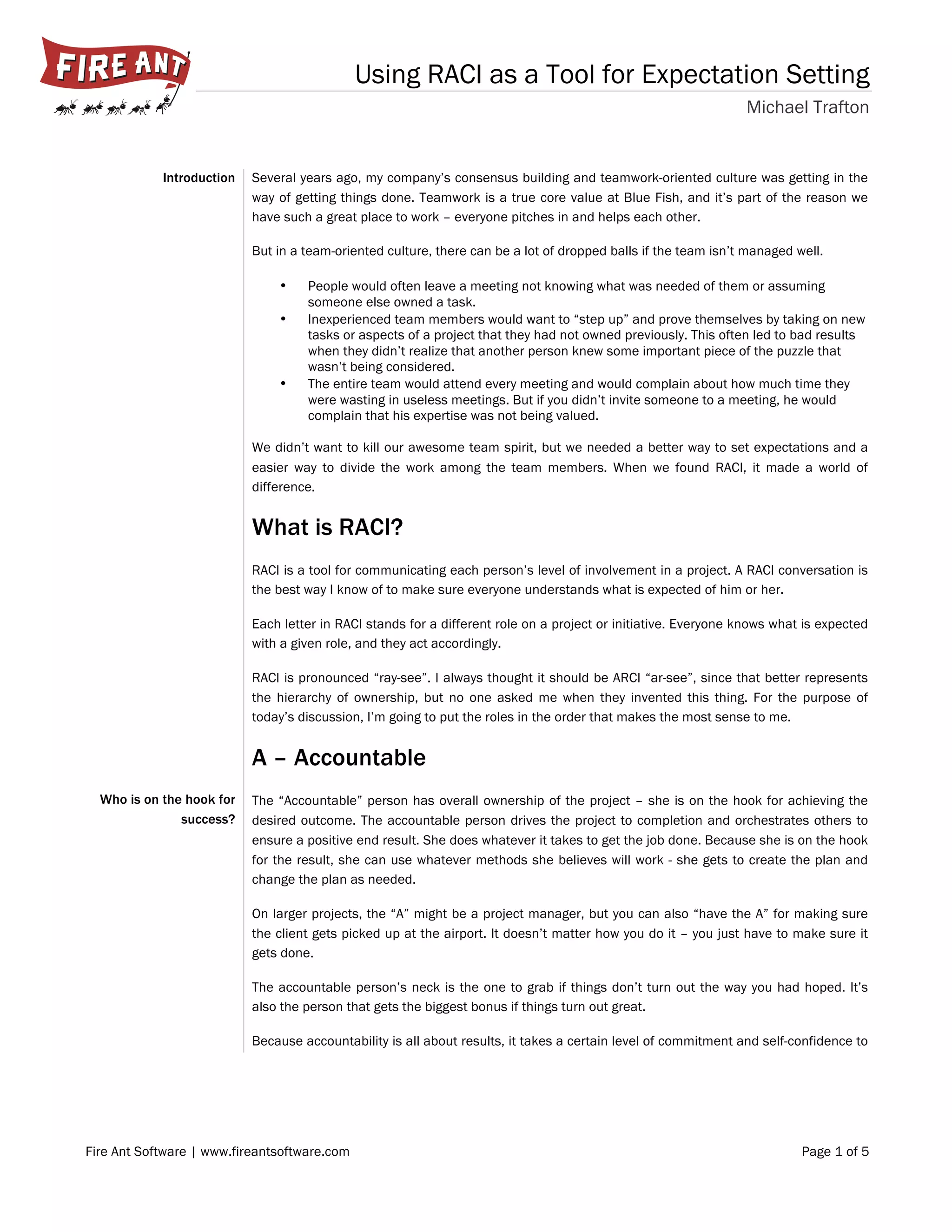 This document discusses the RACI tool, which helps clarify roles and accountability within a project team. The acronym RACI stands for Responsible, Accountable, Consulted, and Informed, each representing different responsibilities of team members to improve communication and project success. The author emphasizes the importance of assigning clear roles to prevent confusion and enhance project management efficiency.
