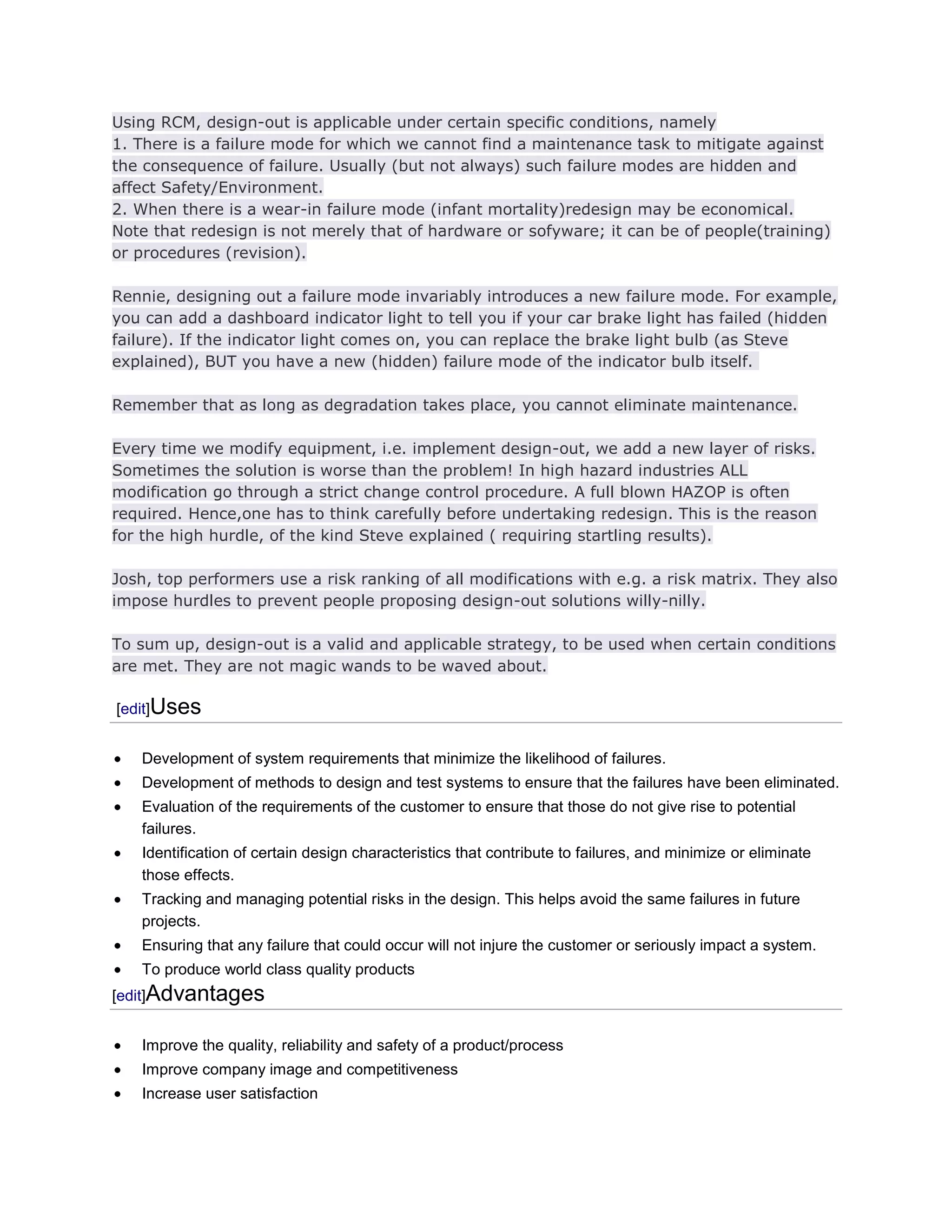 This document discusses reliability centered maintenance (RCM) and when design-out is applicable as a strategy. It notes that design-out can be used when there is a failure mode that cannot be addressed through maintenance or when there are wear-in ("infant mortality") failure modes. However, the document cautions that redesign always introduces new failure modes and risks. It emphasizes that design-out should only be undertaken after careful consideration of these risks and impacts.