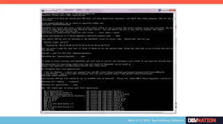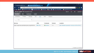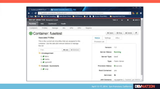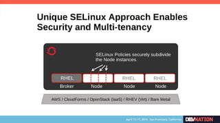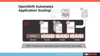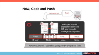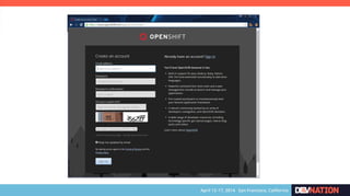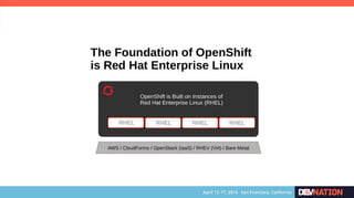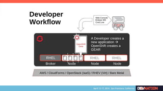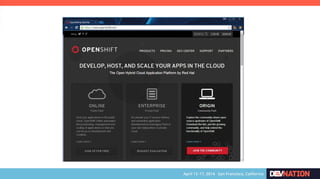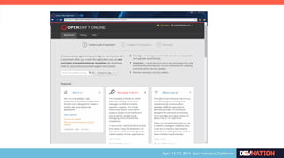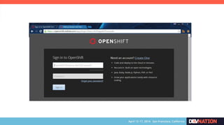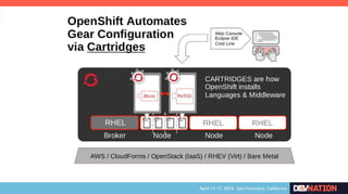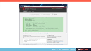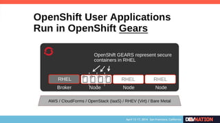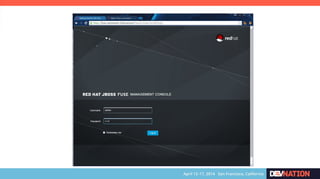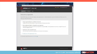 The document discusses using Red Hat JBoss Fuse on OpenShift. It provides an overview of the session which will cover installing the Fuse cartridge, accessing the Fuse Management Console, and deploying and testing a Fuse application on OpenShift. The agenda then outlines discussing OpenShift, JBoss Fuse 6.1, installing the Fuse cartridge, using the management console, and building a Fuse application.