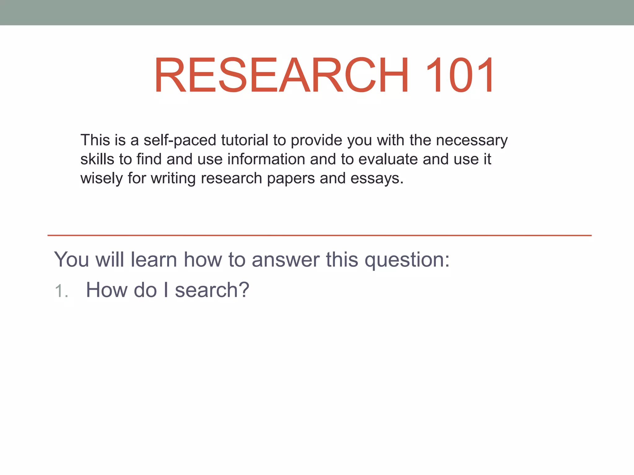 This tutorial teaches students how to effectively search for information from various sources to write research papers. It covers how to formulate search statements using keywords and Boolean operators to search tools like the library catalog, databases, and the internet. Students will learn search techniques like phrase searching, truncation, and field searching to maximize relevant results. The goal is to equip students with the skills to find, evaluate, and apply information from different sources for their academic work.