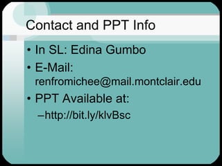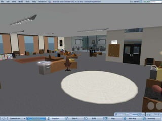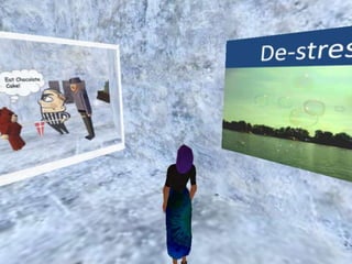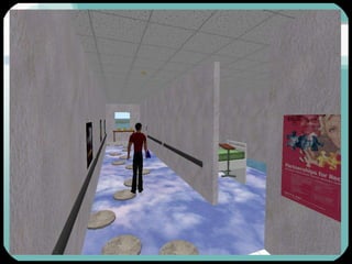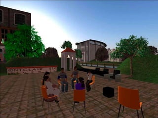 The document discusses the use of Second Life as a virtual learning tool to teach complex theoretical concepts, specifically in counseling education. It outlines the project's purpose, methodologies, and outcomes, emphasizing student engagement through interactive learning experiences and peer collaboration. Key takeaways include the importance of structured play, the value of peer learning, and the challenges faced due to budget cuts within the educational support system.