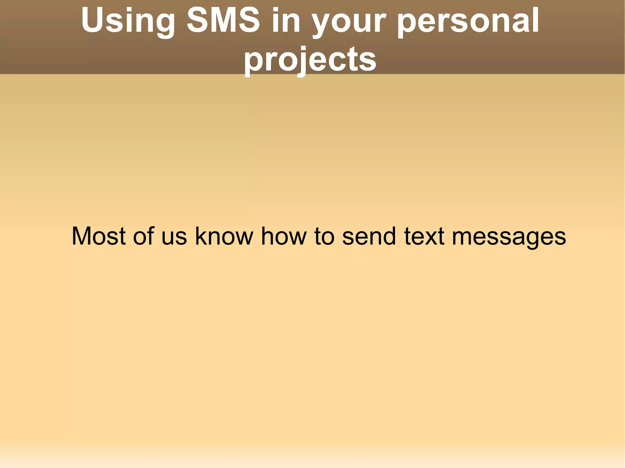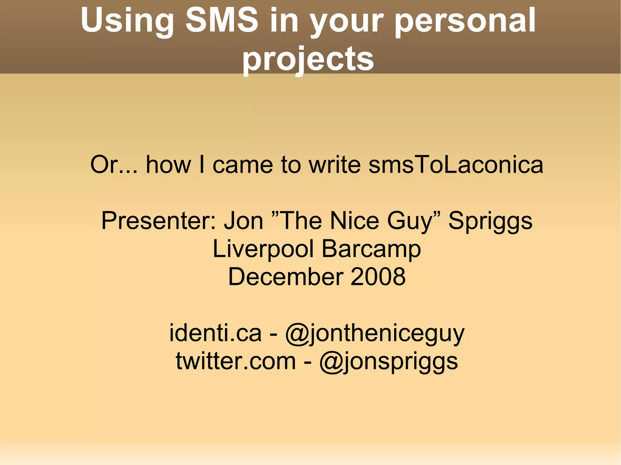 The document discusses how to integrate SMS messaging into personal projects, particularly focusing on the creation of a tool called smstolaconica for sending and receiving messages to microblogging sites. The author shares insights on using mobile phones as modems, learning SMS protocols, and implementing the code within PHP scripts. The source code is available on SourceForge, and the necessary hardware and software requirements are provided.