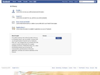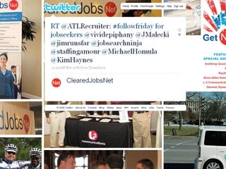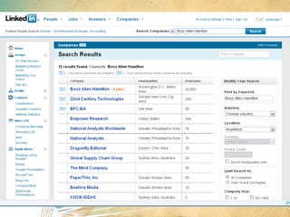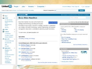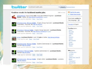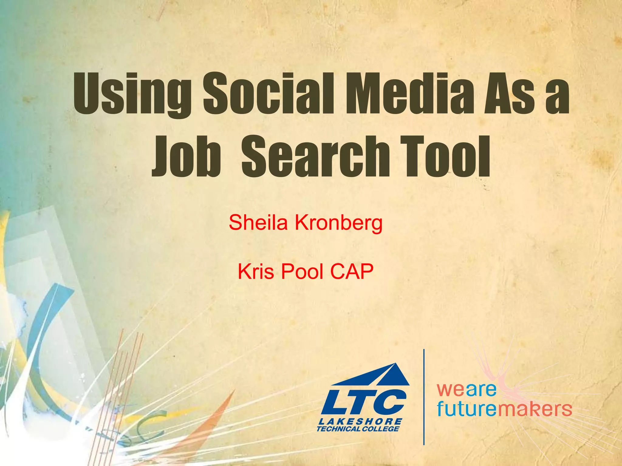 The document discusses using social media as a tool for job searching. It provides tips on creating profiles on LinkedIn, Facebook, and Twitter to engage with potential employers and other professionals in one's industry. It emphasizes building an online professional brand, networking both online and in-person, and maintaining an active online presence through regular posts and status updates. The document also cautions that social media should be used as a supplement to traditional job searching methods, not as a replacement.